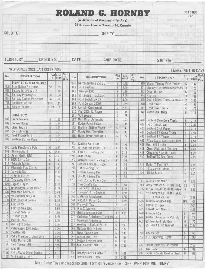 I made an interesting find with regard to Roland G. Hornby. Browsing through the internet I came across a Canadian Dinky Toys/Meccano retail order form/price list of Roland G. Hornby (a division of Meccano -Tri-Ang), Toronto, Ontario, dated October 1967, including Mini Dinky. I was very surprised to find a company with this name in Canada and I began to try to find out what is behind this.