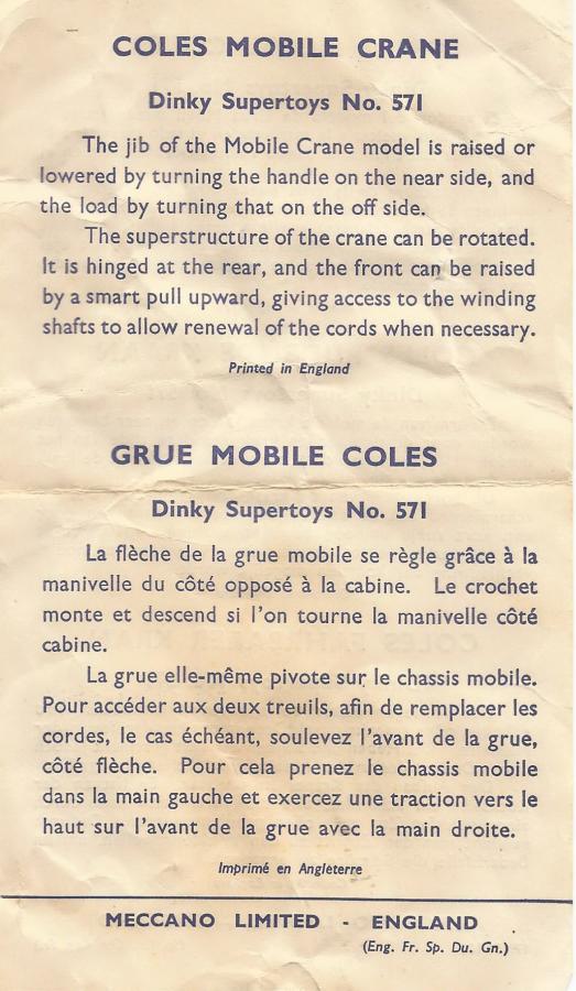 Thanks Dave, no this is not the one I mean. It is in French and I can read with some effort 'Grue Roulante' as a header. Also, the hubs are grooved, although I firmly believe to know that grooved hubs were introduced not earlier than mid-1952, whereas the comment in English reads: "Made in England & imported into France in a special box in 1951". Jacques D, could you join into this discussion? Regards, Jan