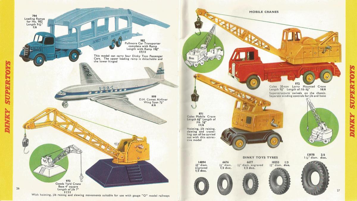 Just managed to add another example of the Coles Mobile Crane to my previous ones. It is the first type - made 1950-1952 - with the early ridged Dinky Toys hubs, as opposed to the later version with grooved Dinky Supertoys hubs. This one and the other example shown must have been produced in about the same period, most probably 1952, as they have come in the same type of original box, still marked 'Dinky Supertoys', so each very close to the moment of change. It strikes me that, looking underneath, the ridged wheels show an extra little ring in between. Althought the box is not perfect, it has all packing pieces there. I thought the couple on the sides were complete, but there is an extra support for the jib. The change-over to the grooved hubs exactly coincides with the use of colour in the catalogues, as far as I'm aware. The black and white - both in Meccano Magazine and in the catalogues - show the Dinky Toys hubs. From 1952 the coloured pictures are seen, with the new grooved hubs.