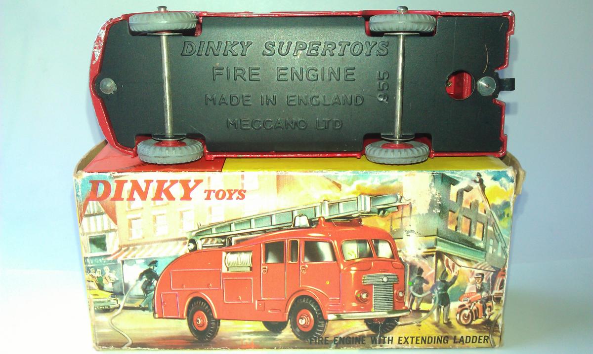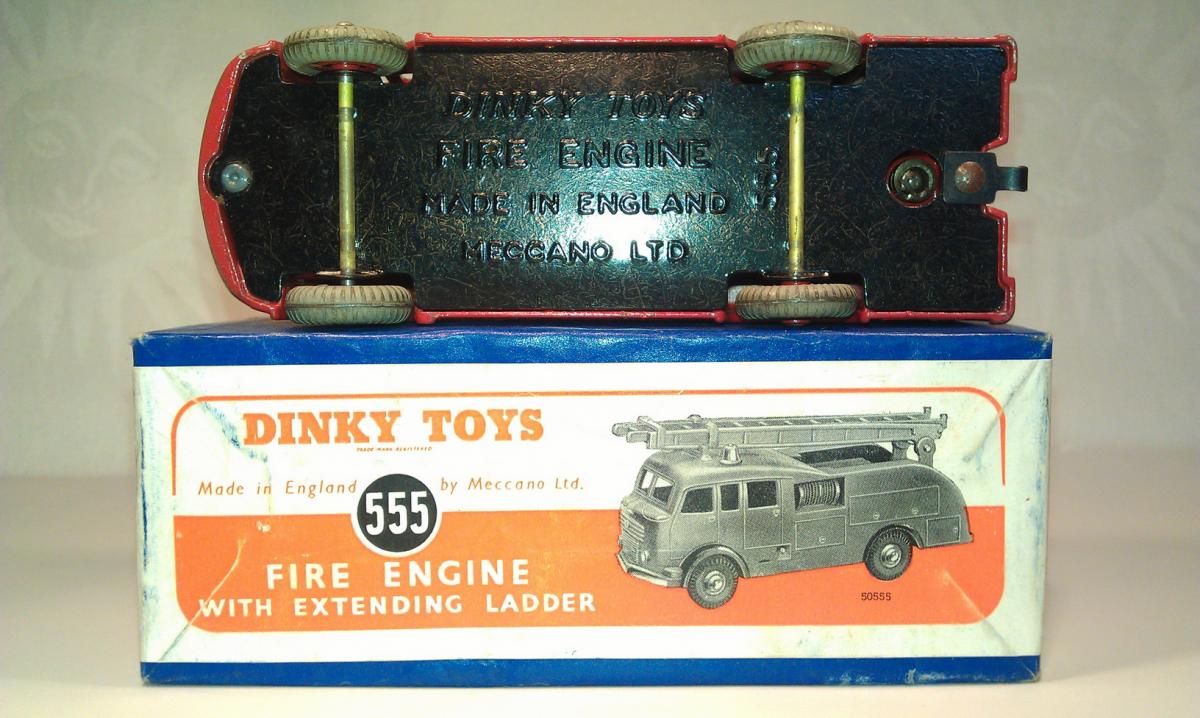 Dinky Toys 555 Fire Engine with brown extending ladder – 1st version – baseplate with number 555.