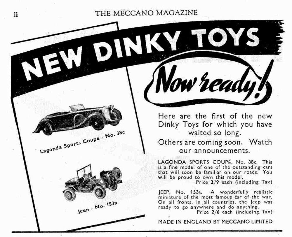 A first issue to be proud of to own, Jan! I am still looking for one, because that very first one only is the really first post-war Dinky Toy and of course with a direct relation to (the end of) WWII. It was first advertised in the April 1946 issue of Meccano Magazine, together with the no. 38c Lagonda Coupe. The latter was also a post-war issue, but designed pre-war already, whereas the Jeep was (of course) a real post-war design.