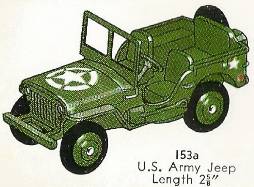 Dinky Toys catalogue 1953 USA with 153a U.S. Army Jeep. Note the raised bonnet and the rounded axle ends.