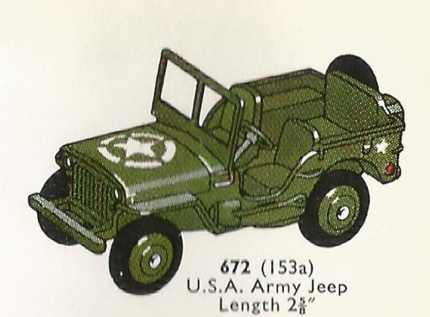 Dinky Toys catalogue 1954 USA with 153a-672 U.S.A. Army Jeep. . Note the raised bonnet and the rounded axle ends.