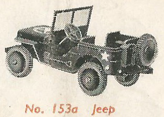 DT 153a Jeep was the first produced new model of Meccano Liverpool after WWII and appeared for the first time in MM of April 1946. It was first called Jeep and later on U.S. Army Jeep for the export version with sales number 672. It was never called Willys Jeep. Only later on the French 80B Jeep is called Hotchkiss-Willys Jeep. The 153a Jeep was only included in the Meccano price list UK from May 1946 till October 1948 and was never included in an UK or Dutch catalogue. It was included in the USA catalogues from 1947 till 1954.