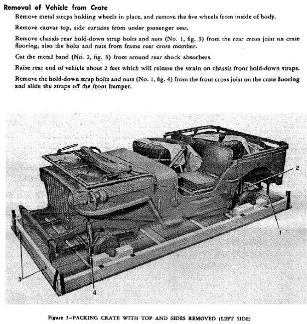 Jeeps could be shipped overseas in crates, after which they were assembled in England. Jeeps were therefore stripped of wheels and some other parts and very ingeniously packaged together in a flat crate to take up as little space as possible for shipping overseas.