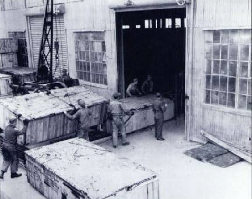 Willys Jeep MB in crate on the conveyor belt.