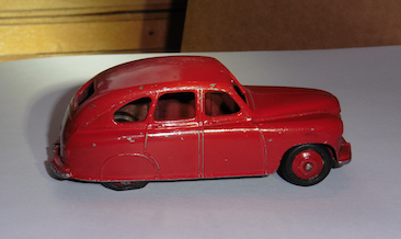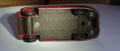 A curious feature of this model is that it was the only one of the post-war British saloon cars to be referred to only by its model name on the baseplate - "Vanguard" rather than "Standard Vanguard". An opposite  precedent had been set by 40a and 40b where only the makers name "Riley" and "Triumph" appeared, to be followed by 40d,f,g etc. (but no 40c) and subsequent renumberings and new additions all showing the full name of the car in question, i.e. Morris Oxford, Austin Devon and so on. Another example of the oddities that make Dinky collecting so fascinating.