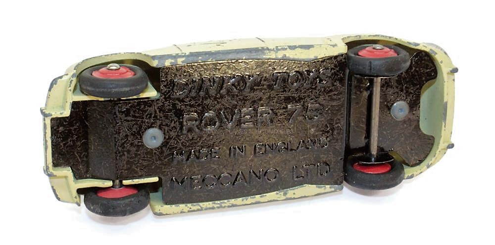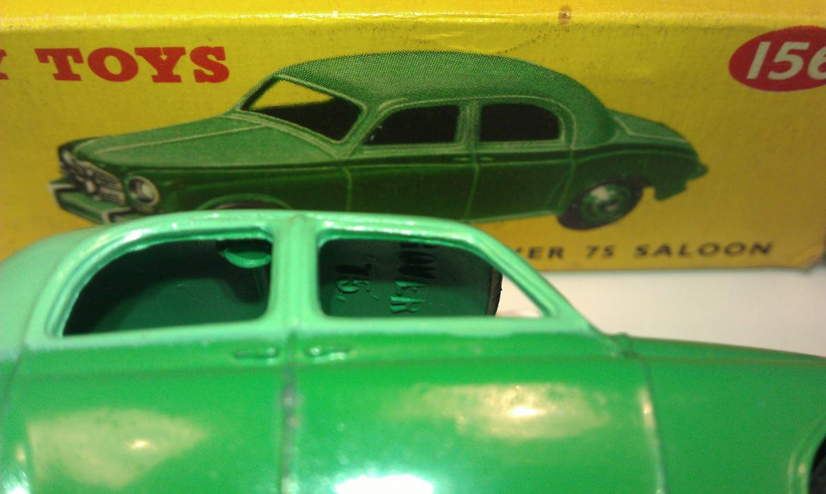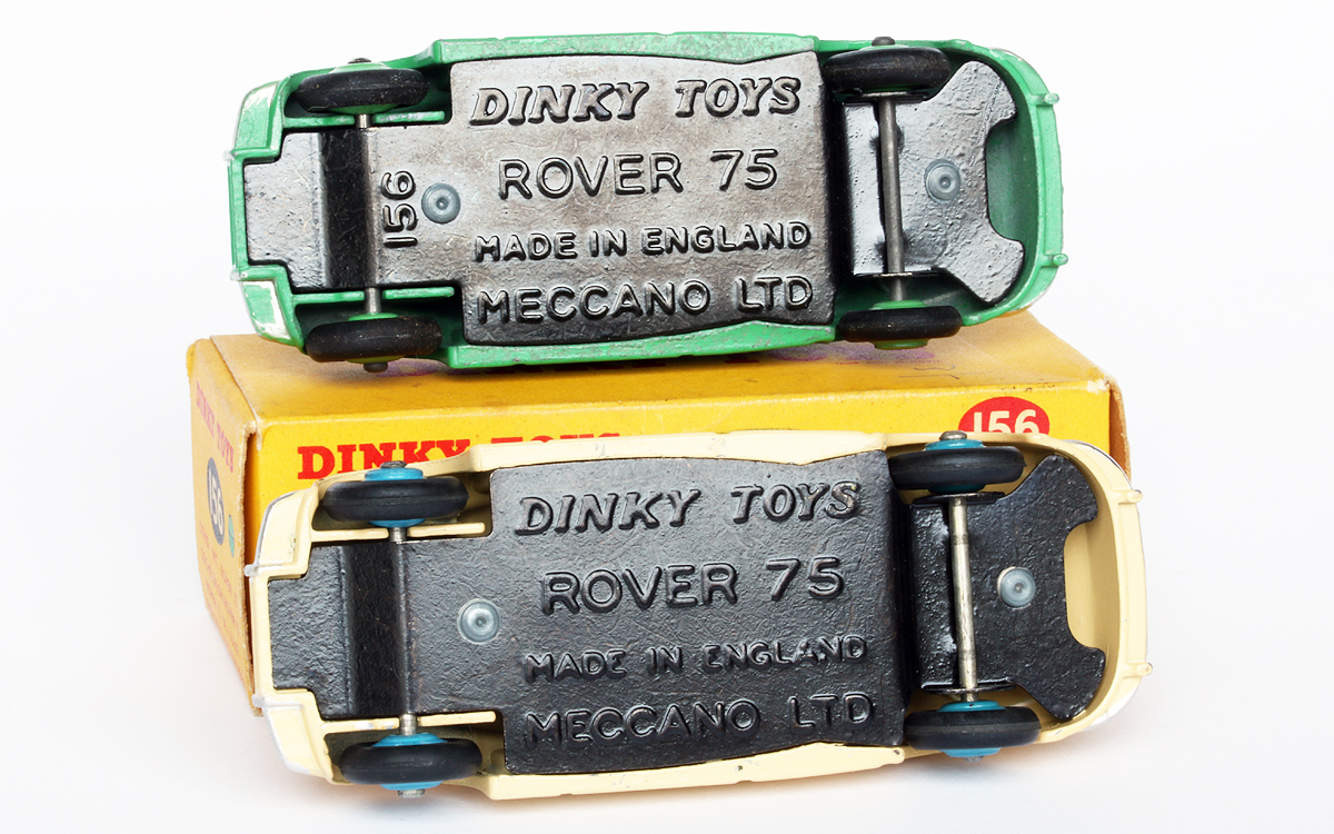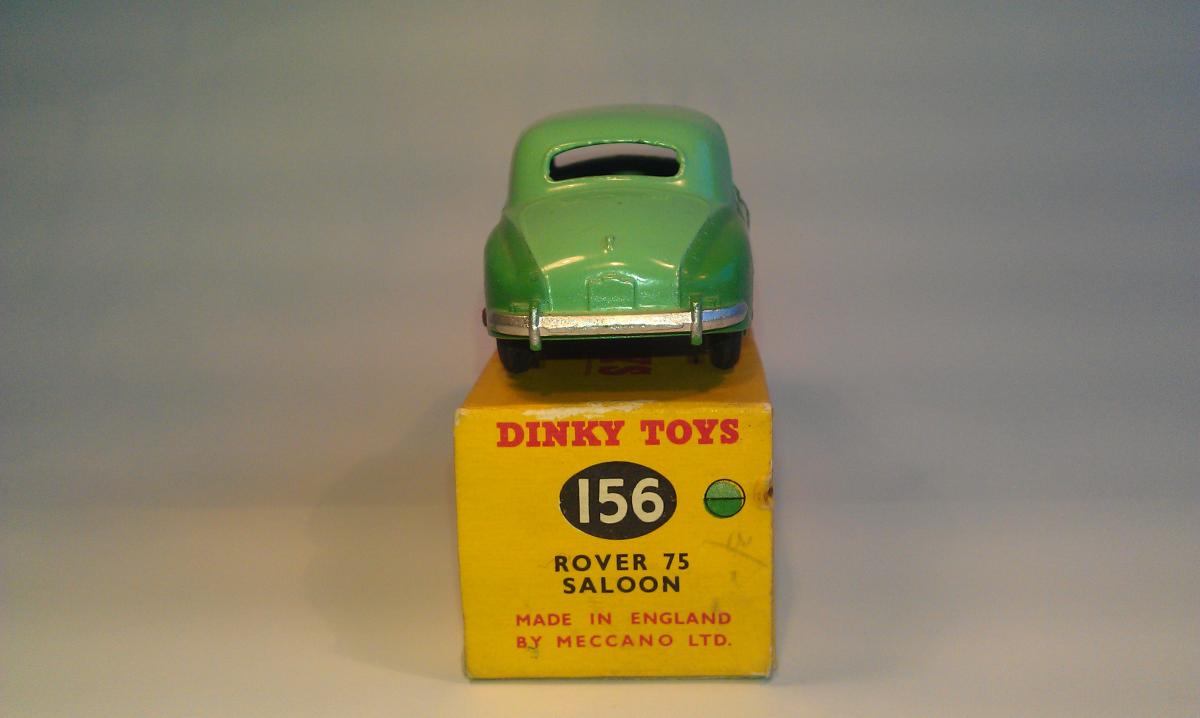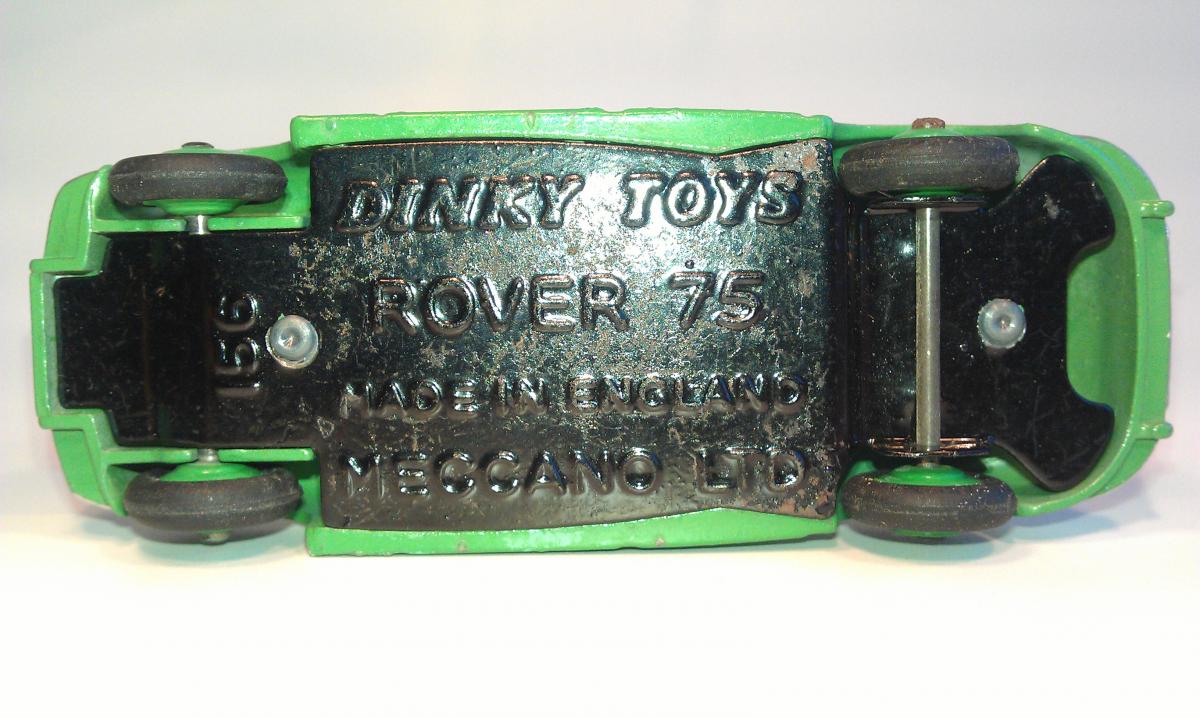 After a disappointing purchase I sold the 156 Rover 75 blue/cream with non-original rivets (of course with the correct description to the buyer). Instead I bought a better 156 2-tone green with number 156 in the base plate and Rover 75 cast-in underside of the roof. The box has the correct colour spot and a pencil price of 3 / - on it. This was the price from October 1955 to May 1958.