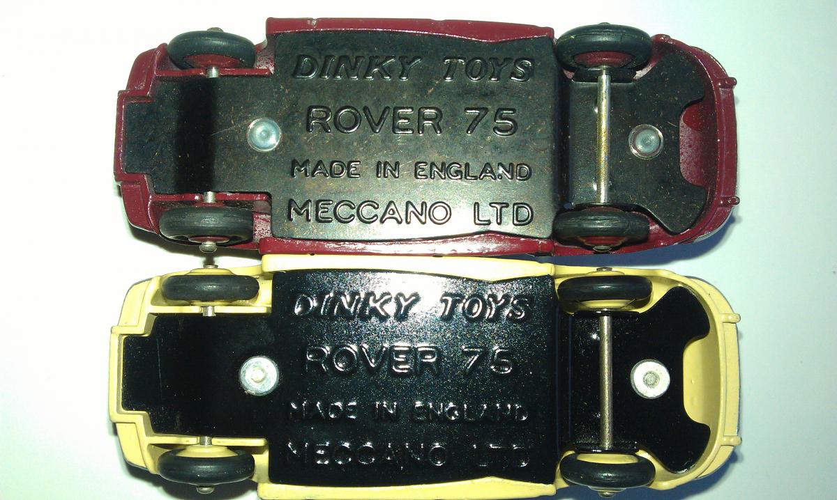 No idea why this is a 'Trade Boxes' thread (I see no trade box here), but it's the most recent and most frequently used thread for the Rover 75, so why not add some new, more detailed pictures of the earlier plain cream one (140b? with blue hubs) here, and the regular 1956 two-tone green version. Both have ROVER 75 cast into the ceiling of the model.