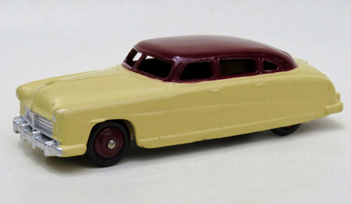 139b Hudson Commodore, plain interior roof, light cream in a matte finish, with gloss dark maroon, almost dark brown roof and window frames and ridged hubs, small base plate letters with no model number.