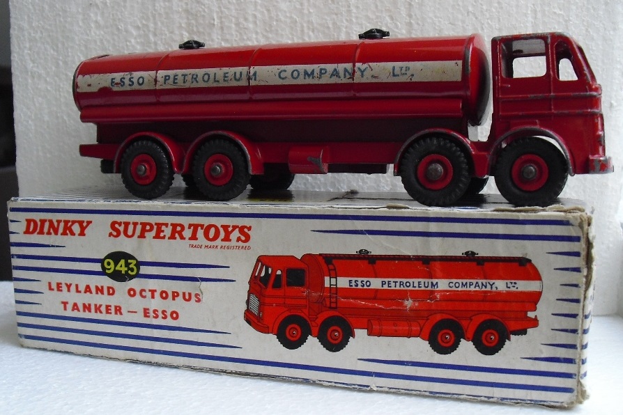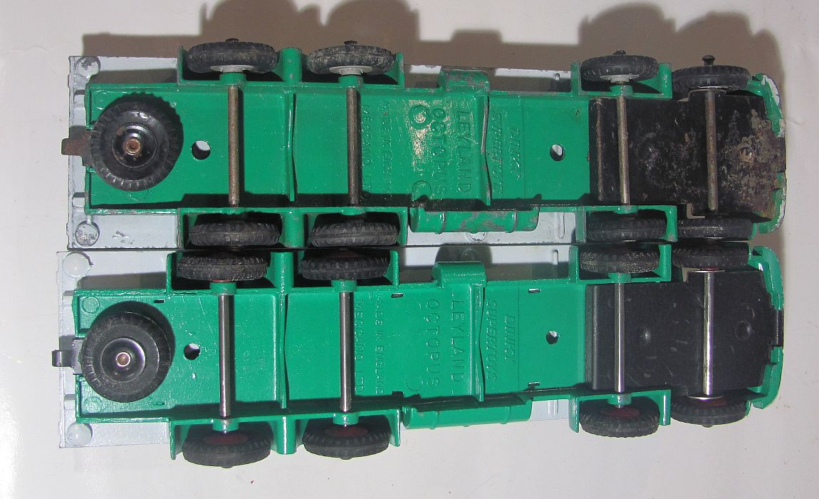 One of my favourite Dinky Toys in the Leyland Octopus. I could not resist a 935 Leyland flat truck with chains fitted with grey wheel hubs, although it was play worn. I have a mint boxed red wheel one and it was interesting to compare them. The later grey wheeled one does not have the tin-plate tank slots and the screw holes for the plastic tank are larger. The green paint is slightly darker and the ejector pins are more prominent - probably 'wound back' since the removal of the tank slots.