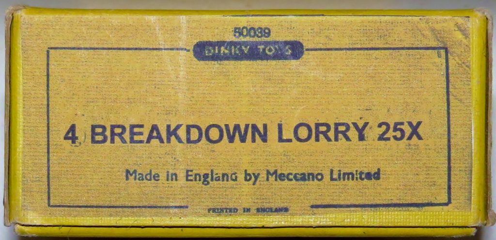 Someone has gone to extraordinary lengths to bring about this deception. Someone who knew the 25x came in a trade box for 4, as well as the factory Code Number at the top of the label, 50039 where usually the name DINKY TOYS appears. Was this Trade Box created by a collector whose only interest was for his own purposes who has since passed away taking with him an explanation. Whatever the reason, a vendor has lodged with your company an item that misrepresents a true 25x Breakdown Lorry Trade box.