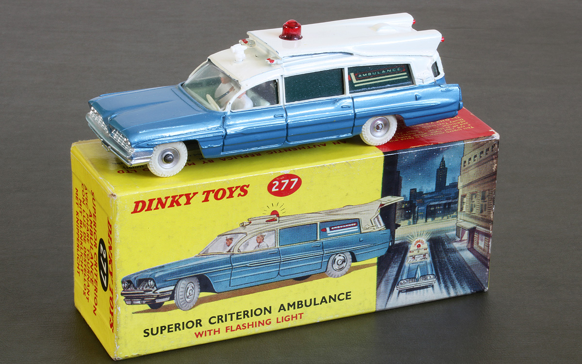 One of the very few 1960s British Dinky Toys that I really admire arrived recently, the no. 277 Superior Criterion Ambulance with Flashing Light, the more sophisticated brother of the regular no. 263 Superior Criterion Ambulance. I don't care a great deal for the flashing light, but as a colour variant and with its bright small white treaded tyres I think it's a marvellous companion to my 55 years ago acquired no. 263. I have some remarks and questions remaining, to be posted one of these days in the appropriate thread, with better photos, still to be taken. Kind regards, Jan
