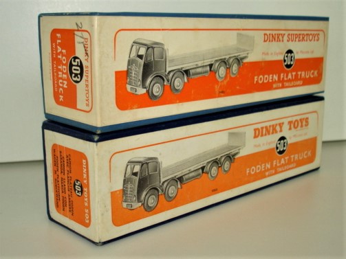The box is the first blue covered box for a second type Foden I have seen branded as Dinky Supertoys. Also on the left side of the label only English text is written whereas on the normal label the model is described in three languages.