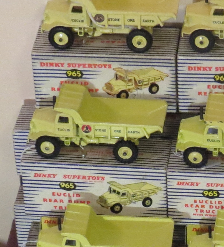 The Box - yes, another correct answer! The box should be the later blue-striped with the wording DINKY SUPERTOYS in italics, thus, DINKY SUPERTOYS. The box has the Inspection code of DW1255 - almost five years BEFORE window glazing was added to Dinky Toys and Supertoys. Fortunately, I have a model in an incorrect box as shown in the 965 Topic, and the models can have their boxes swapped, as they match the relevant box Inspection Data. So, we had a recognised collector who innocently provided a box for his Euclid with window glazing, but unfortunately, he selected the incorrect box! I think we are all guilty with doing this, so care has to be taken! This is the model in my collection that does not match its box. (The complete picture can be found in the Euclid Topic, http://dtcawebsite.com/node/1027?page=2.) The model/box is second row, first one.)