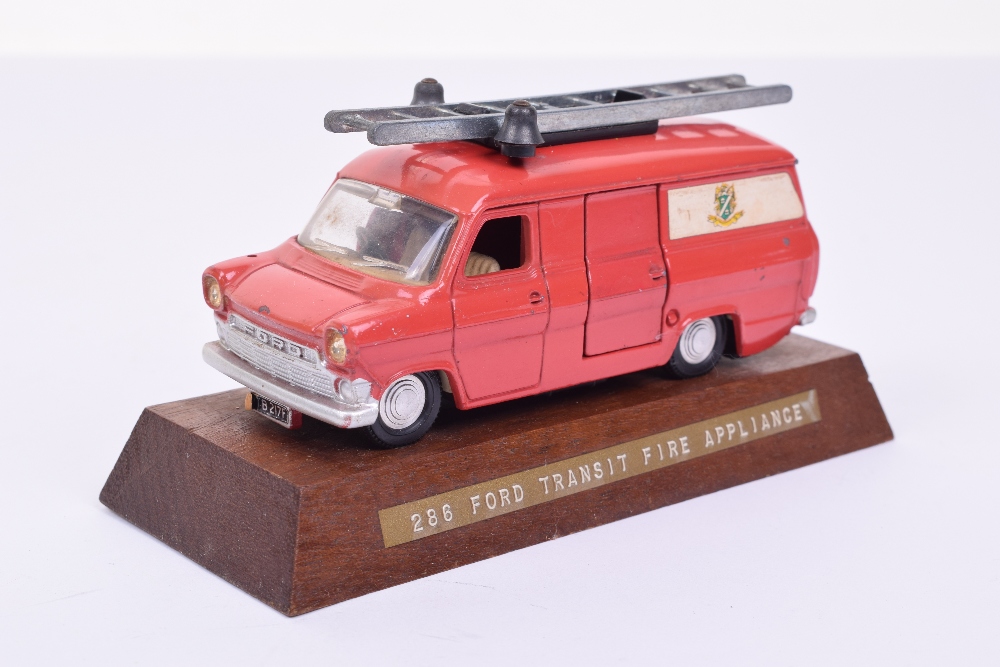 A 286 Ford Transit Fire Appliance mounted on a wooden plinth. The label is different to those I have seen, unless the label changed at some point in time. As this model was a salesman's sample, it is possible it was a pre-production version produced quickly as a selling aid with the label changing by the time the 286 went into full production. I am sure Jacques will have an answer!