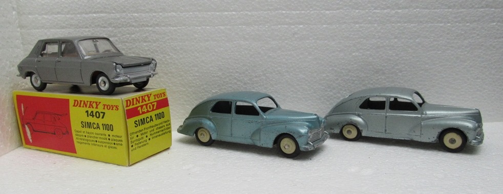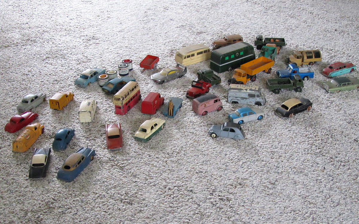 Well Jan, you have quite a collection there! This is how I like to buy my Dinkys - played with but (as far as I can see) essentially sound examples. I don't recognise the blue car with the white roof, next to the paint tins. Is it a Vedette?