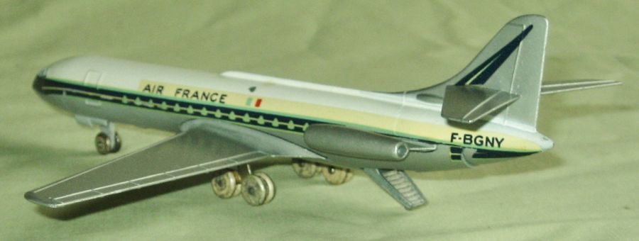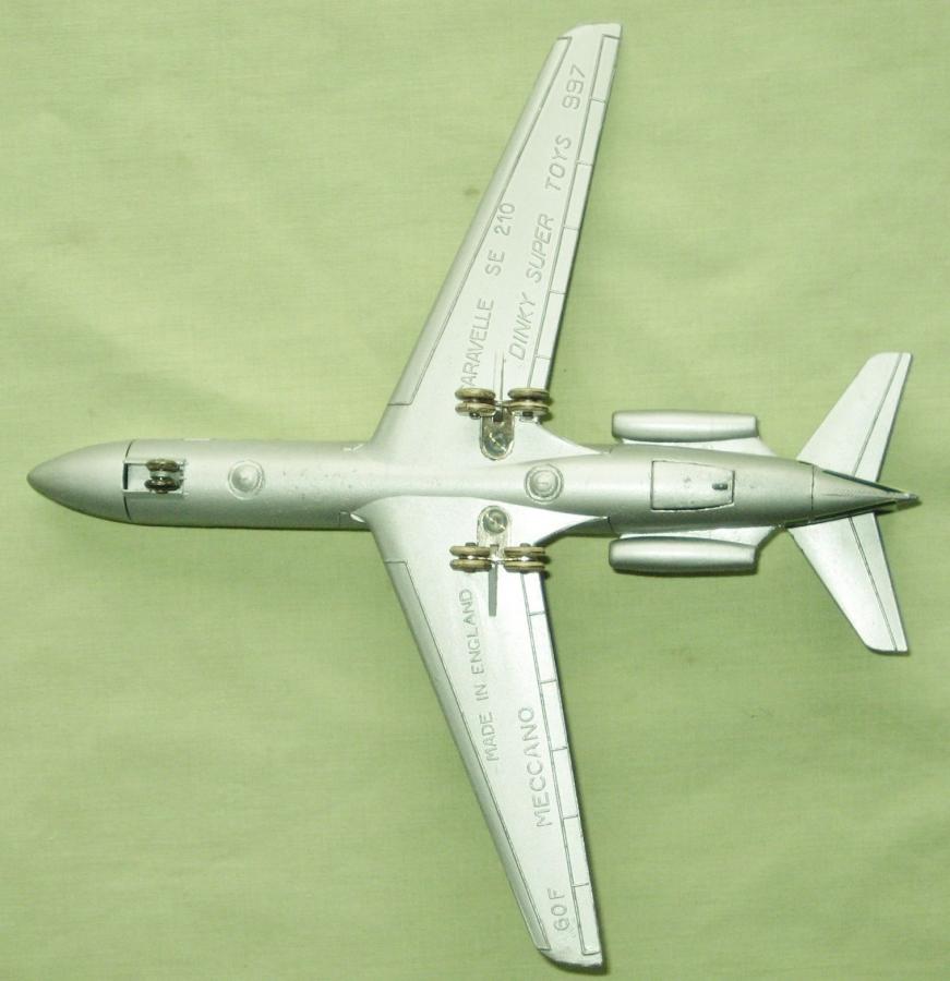 This came a few days ago - a Dinky Supertoys Air France Caravelle SE 210 Airliner. This is the English version which was made between 1962 & 1965. It has the retractable stairs under the tail and also note the words Super Toys under the wing rather than Supertoys.There are quite a few variations with different airlines featured on the fuselage - Air Algerie, Swiss Air, Scandinavian Airlines System and SAS and with different registration numbers. The die apparently went between England & France several times. Rather strangely the windows are slightly triangular rather than round.