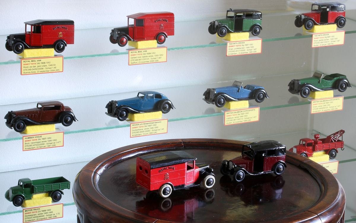 Three wonderful acquisitions this month, all within the 1945-1950 time span. An early post-war no. 34b Royal Mail Van, this one with open oval rear windows, early smooth hubs and very nice fresh white treaded tyres. Also a maroon no. 36g Taxi with Driver, although with later ridged hubs still with early open tiny rear window. And finally a no. 14c Climax Fork Lift Truck, an early production example with large black round treaded tyres and packed in a less common green labelled orange lift box. Time to produce new display labels, supports, photos and catalogue descriptions for each of them! Kind regards, Jan