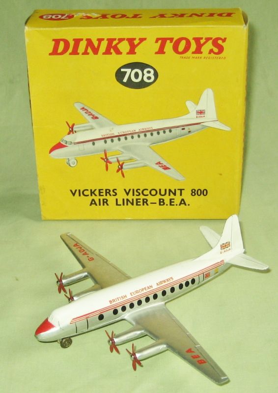 Here are 3 new arrivals, all aircraft. Firstly the Dinky 708 Vickers Viscount in BEA livery. Secondly the Dinky Supertoys 998 Bristol Britannia Airliner  and thirdly the Dinky Supertoys 999 D.H.Comet. All are in excellent condition with good boxes. The Britannia has the internal packing in the box.