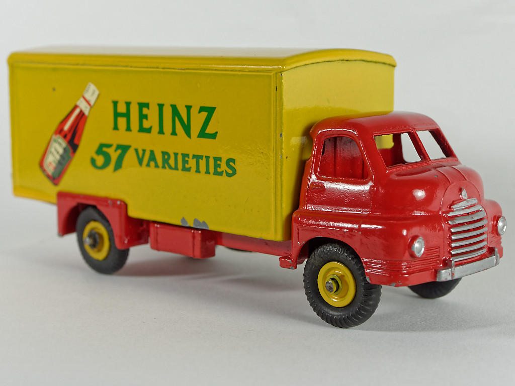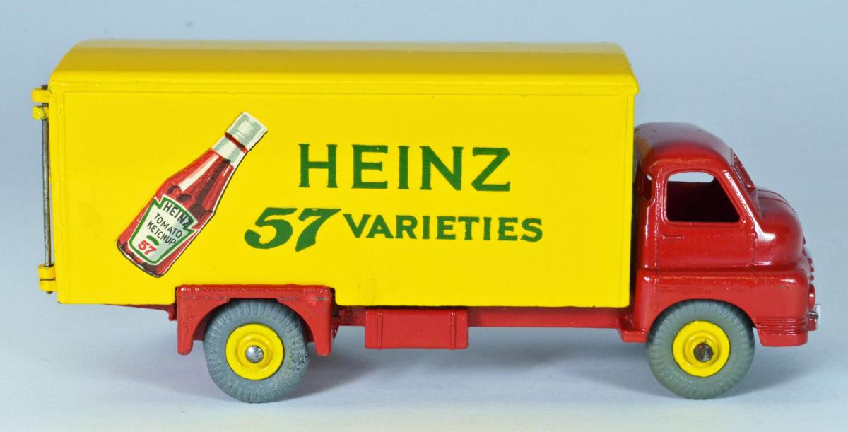 Jonathan—More nice additions! You keep finding very versions of models you need or want, which has to be very satisfying. Without better photos, I can’t comment much on your Bedford van, if it has been restored or not. That version, with the Ketchup or sauce bottle, is quite rare and very pricey in excellent original condition. All the ones I have seen do wear the grey radial treaded tires. I am posting a pretty good photo of mine, so you can clearly see the side logo. I have heard that the repro decals do not include the small pickle or gherkin shown. But it does show very nicely!