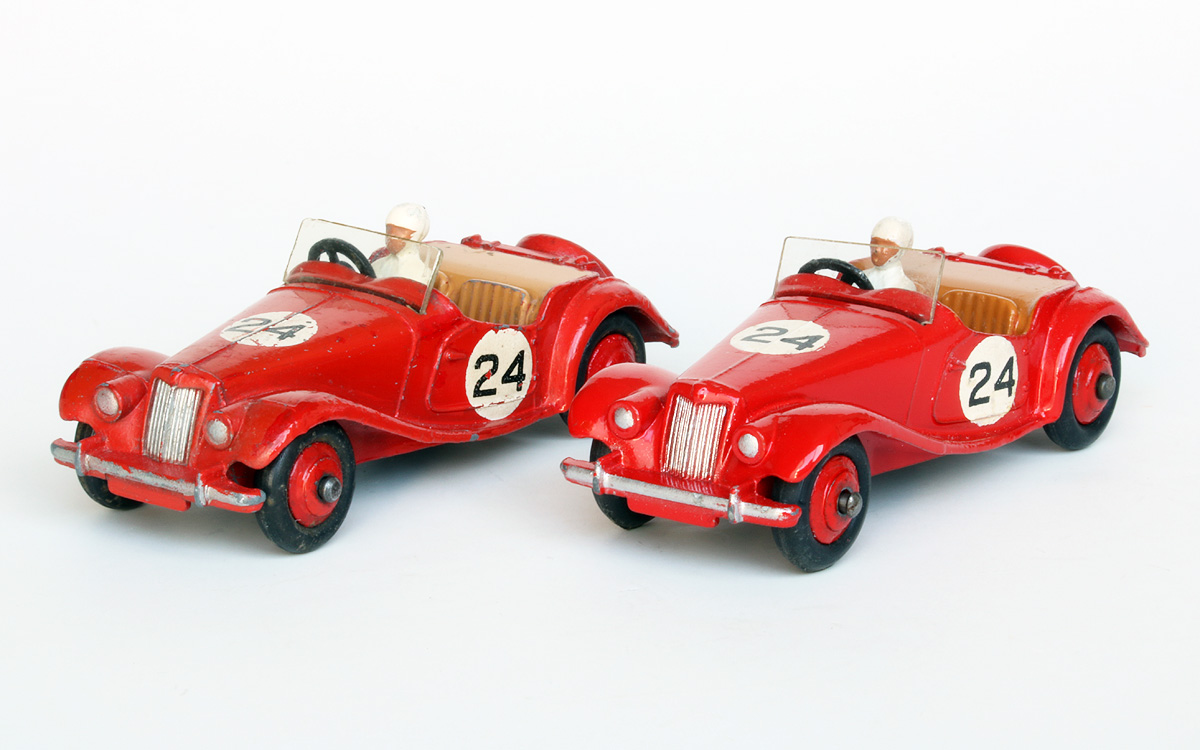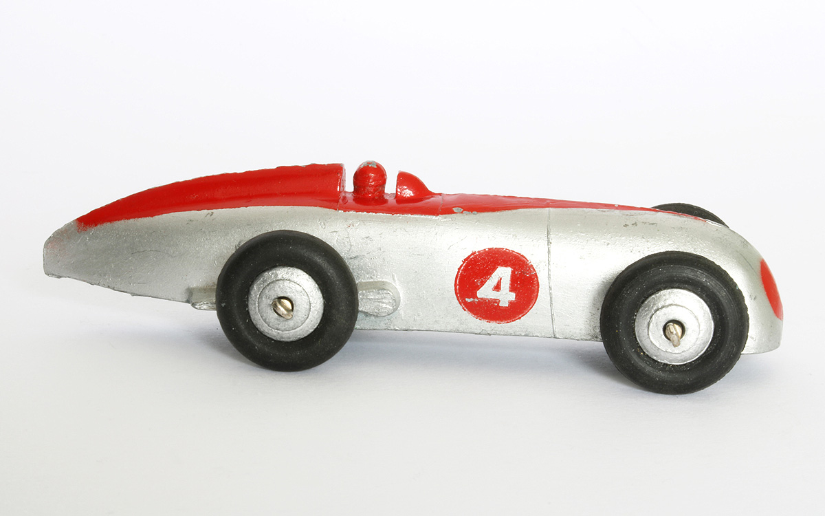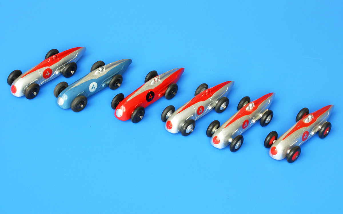 And a fair no. 23a (Small Open) Racing Car, in silver with silver wheels and continuous red stripe on top, crimped axle ends and central cross strengthening bar inside. This one making the sixth postwar variation. Kind regards, Jan