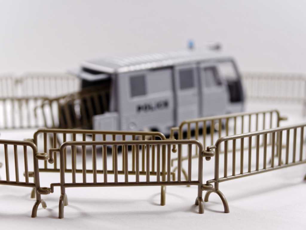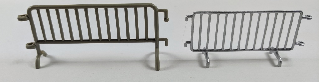 I present a comparison between the plastic Dinky barriers and a current Norev production, which is the same barriers modeled in metal. I had not expected the difference in scale -- the Dinky barriers are 30mm high whereas the Norev is only 25mm high. Assuming that the 12-bar barriers modeled by both Dinky and Norev were the same height as the 14-bar Vauban barriers still sold today, I calculate that the Norev model is 1/43 scale, while the Dinky, surprisingly, is 1/42nd.
