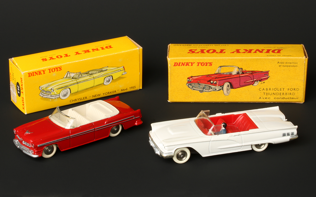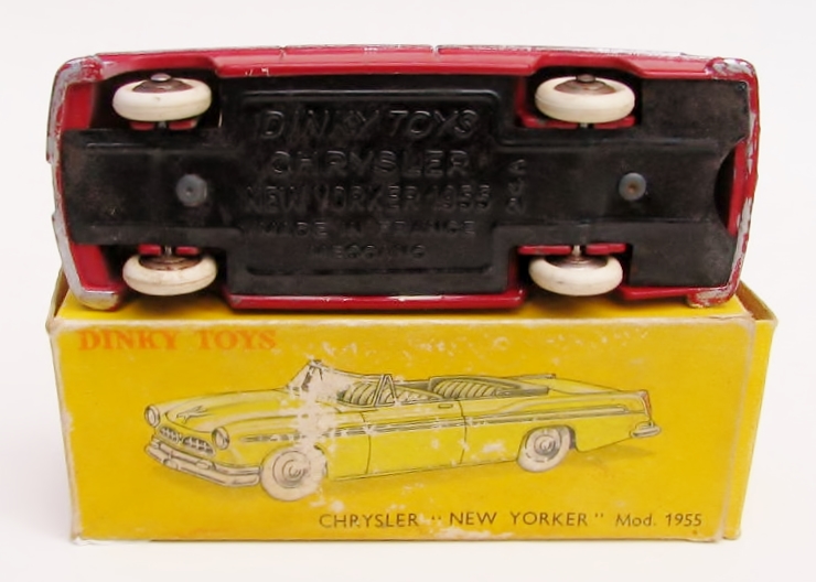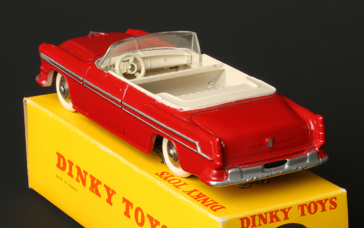 The Chrysler New Yorker was introduced in Meccano Magazine of October 1956, as the third American of the French factory, as stated by Meccano Magazine. Slightly before, in the September Dinky Toys catalogue of 1956 it was announced for the first time already. The Chrysler was issued together with the Auto de course Ferrari, no. 23j. It was the first convertible manufactured by Meccano France with a moulded wide plastic windscreen, similar to the somewhat earlier (1955) Packard Convertible of the English Dinky Toys range. In fact, both models have a lot in common in terms of appearance and size. The usual white tyres give the model just a bit more elegance than the Packard. The French did not fix a driver yet. That happened with its successor, the Ford Thunderbird Cabriolet (no. 555) of 1961, featuring also fingertip steering and suspension. Like the no. 132 Packard Convertible from Liverpool (and its companion, the Cadillac Eldorado, no. 131) the steering wheel on this model is left-mounted and the whole construction is similar. With an actual wheelbase of 3200 mm and 64.5 mm of the model, the scale is 1:49.6 or rounded 1:50.
