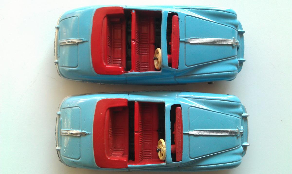 My 2 Dinky Toys Austin Atlantic - above red gloss interior - under red matt interior - under slightly lighter light blue shade.