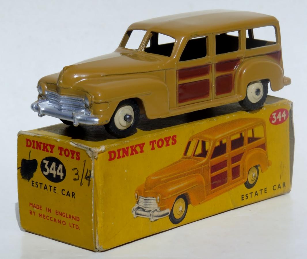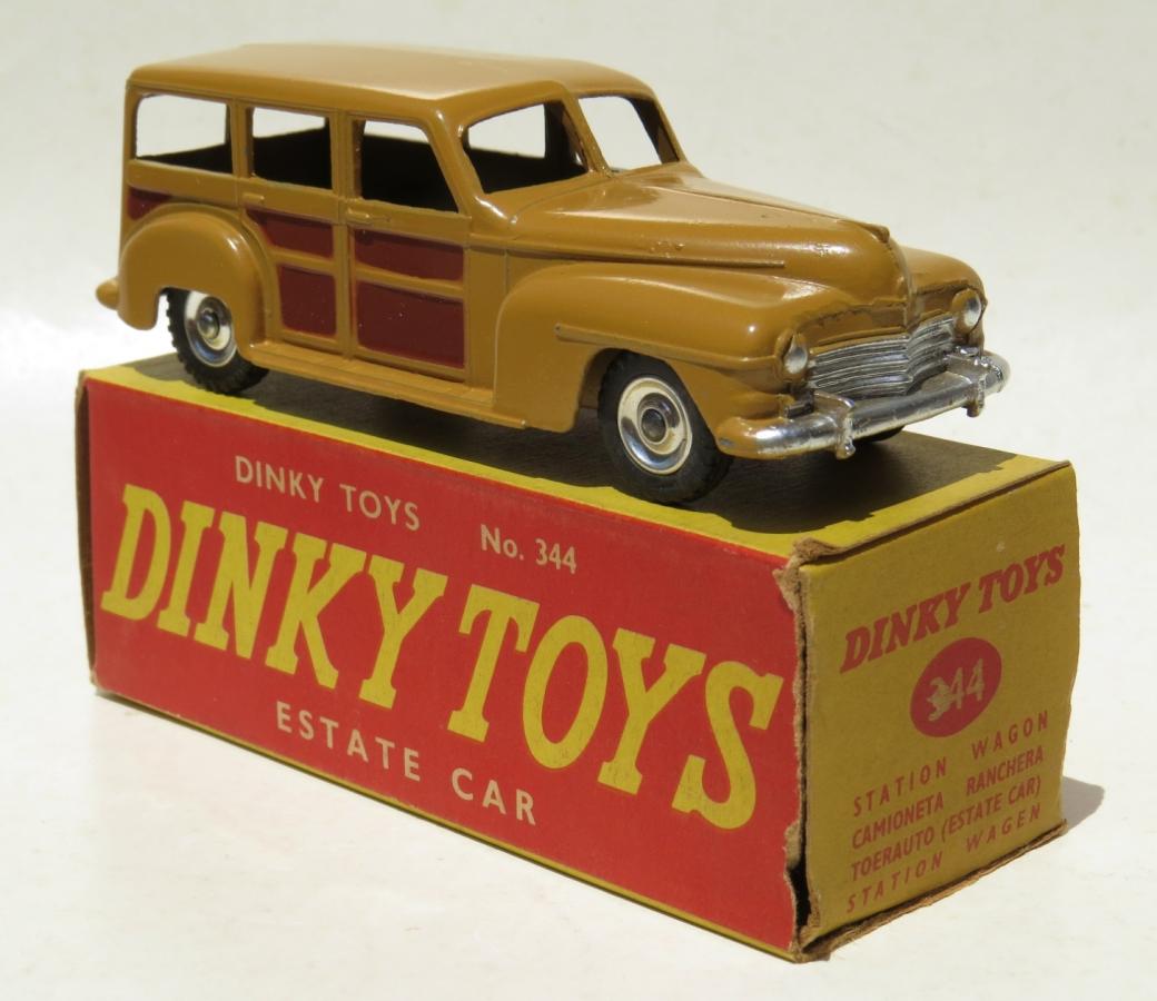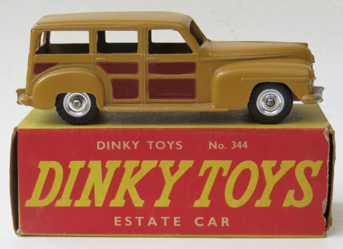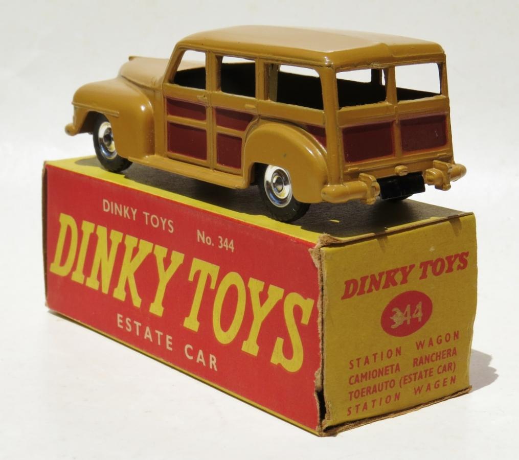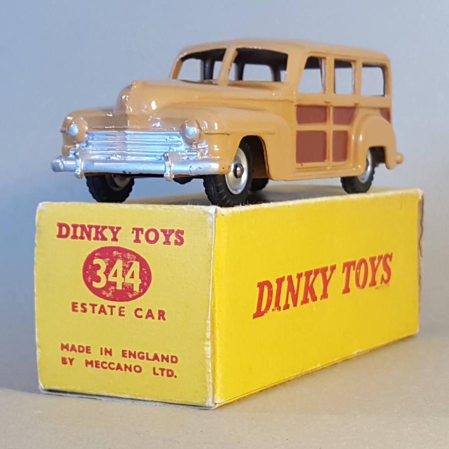 Dinky No.344 Estate Car - light brown with dark brown panels, spun hubs, ridged black tyres and later baseplate with No.344 inscribed - Near Mint in Fair dual numbered picture box. Scarce.