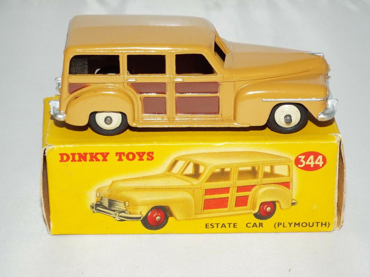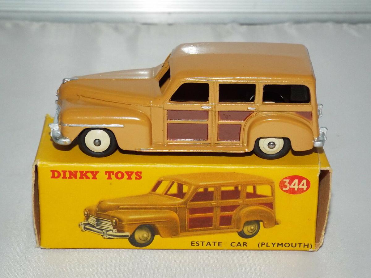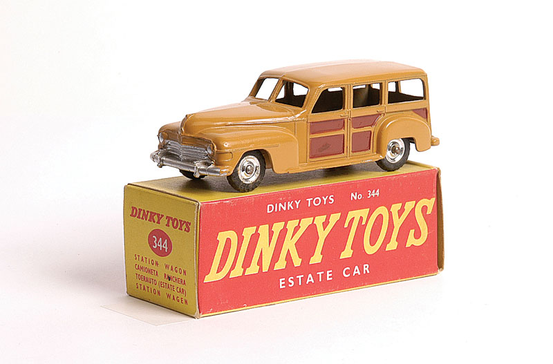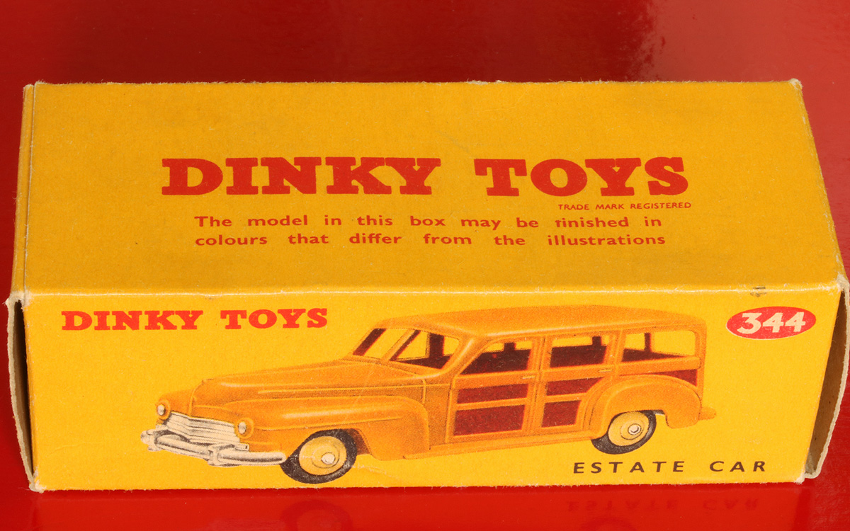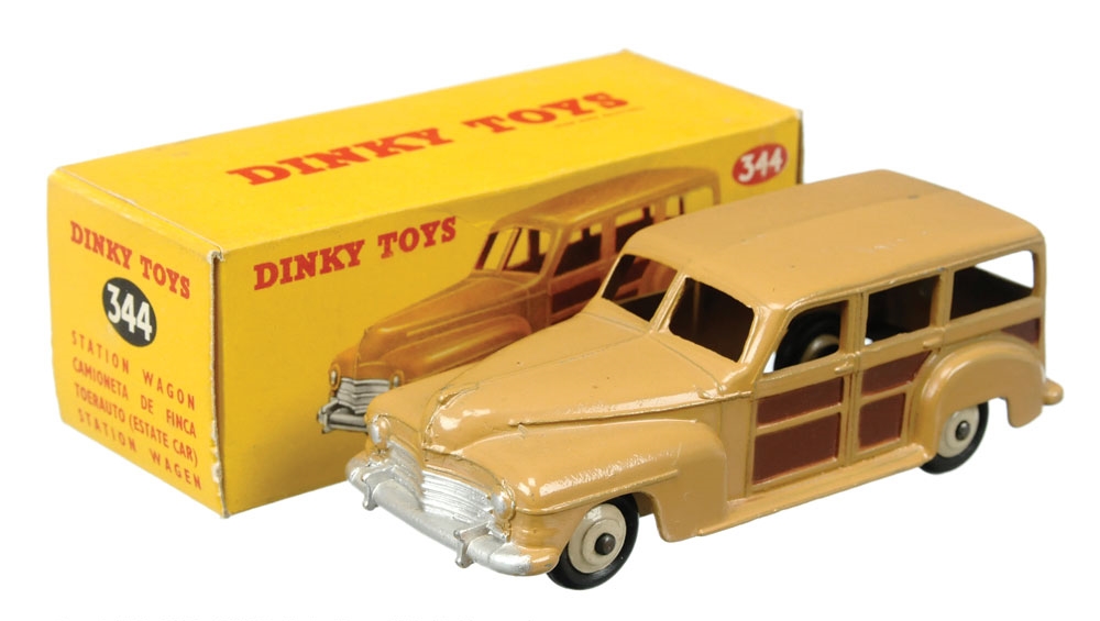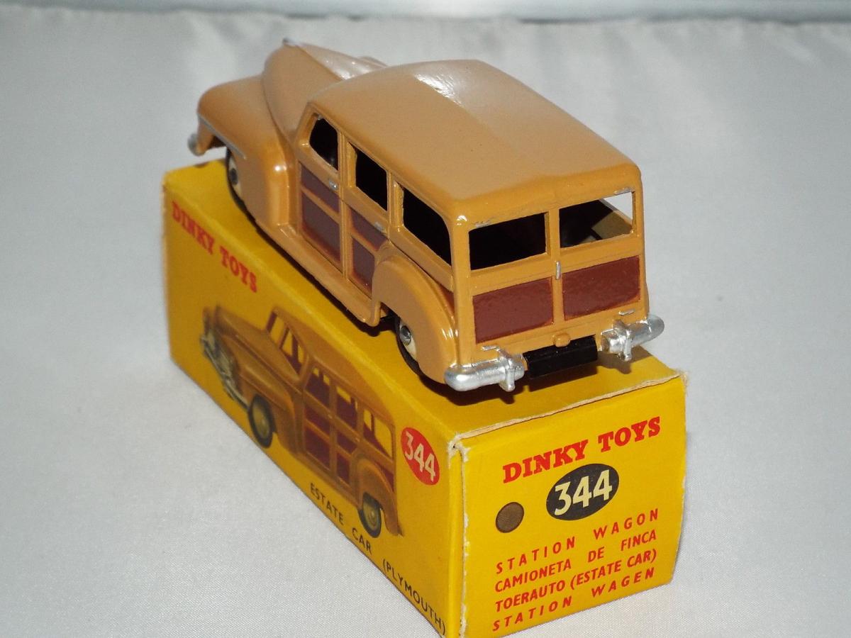 Dinky No.344 Estate Car - light brown with dark brown panels, spun hubs, ridged black tyres and later baseplate with No.344 inscribed - Near Mint in Fair dual numbered picture box. Scarce.