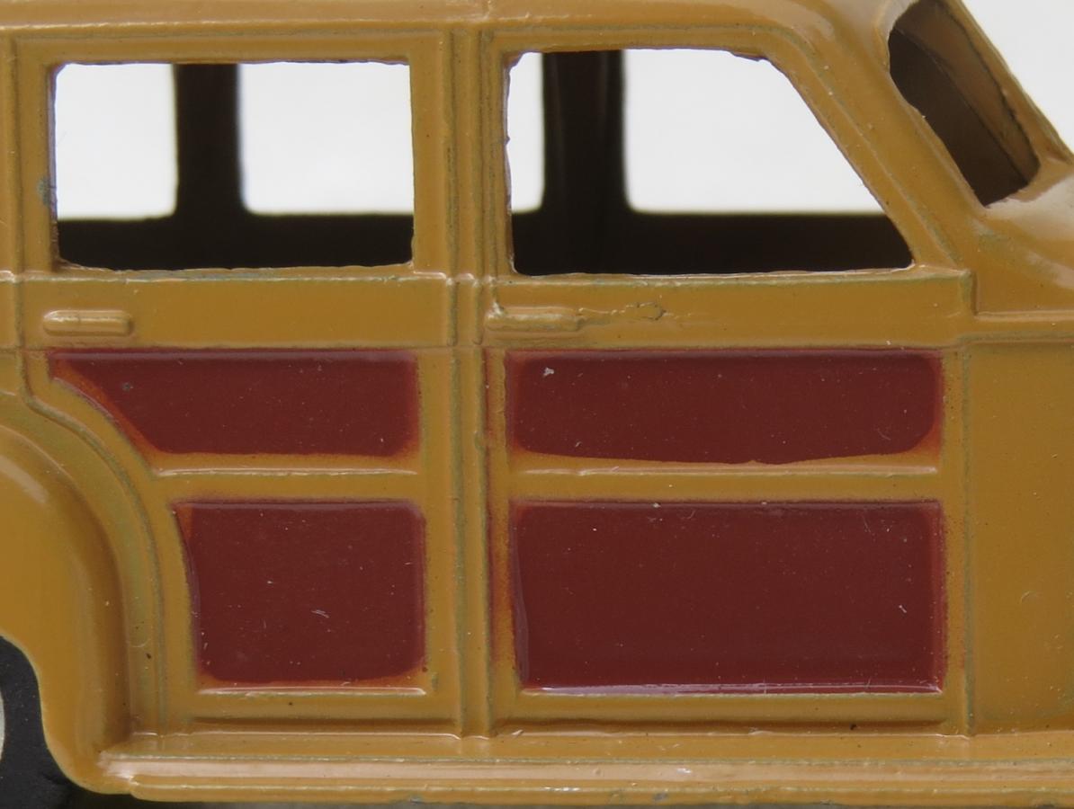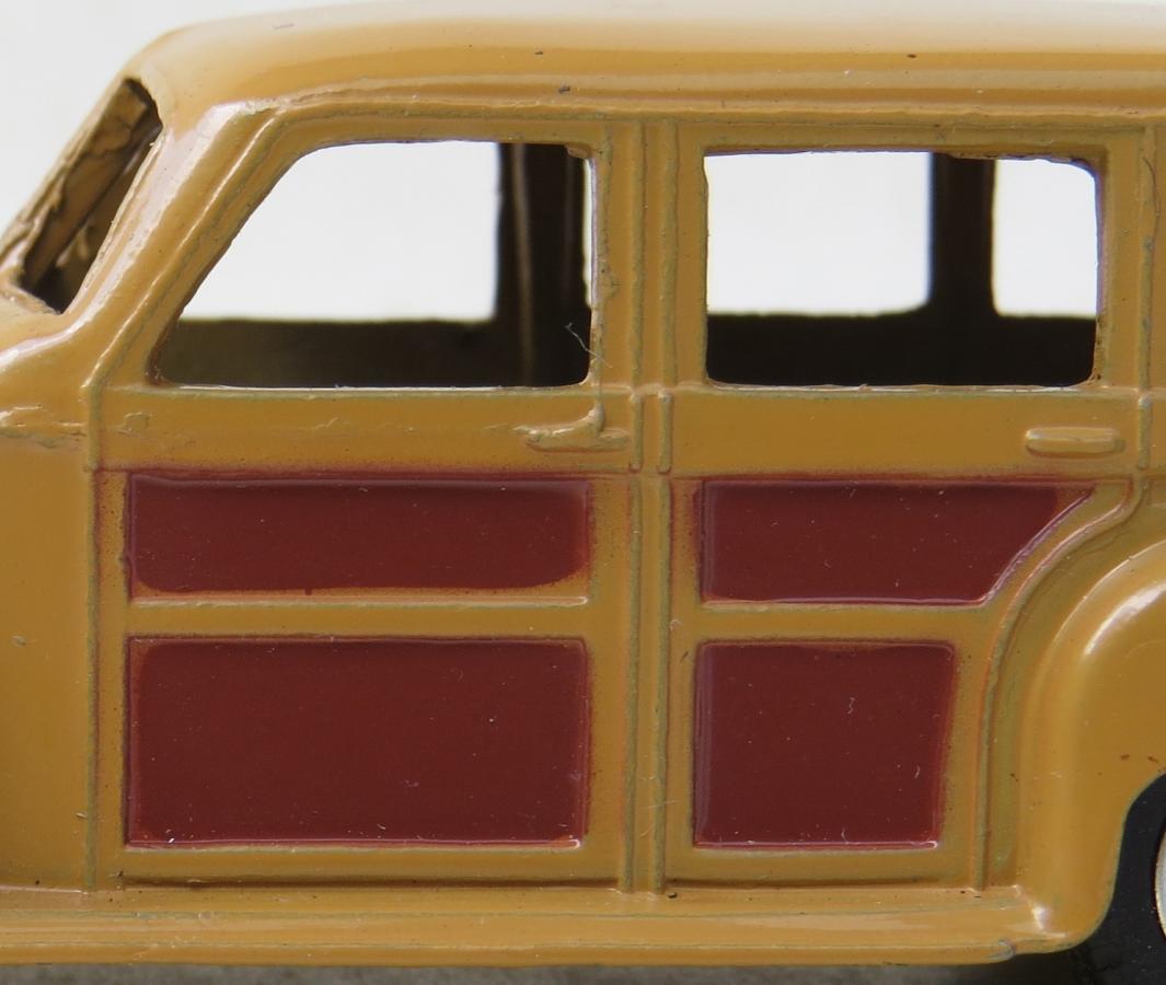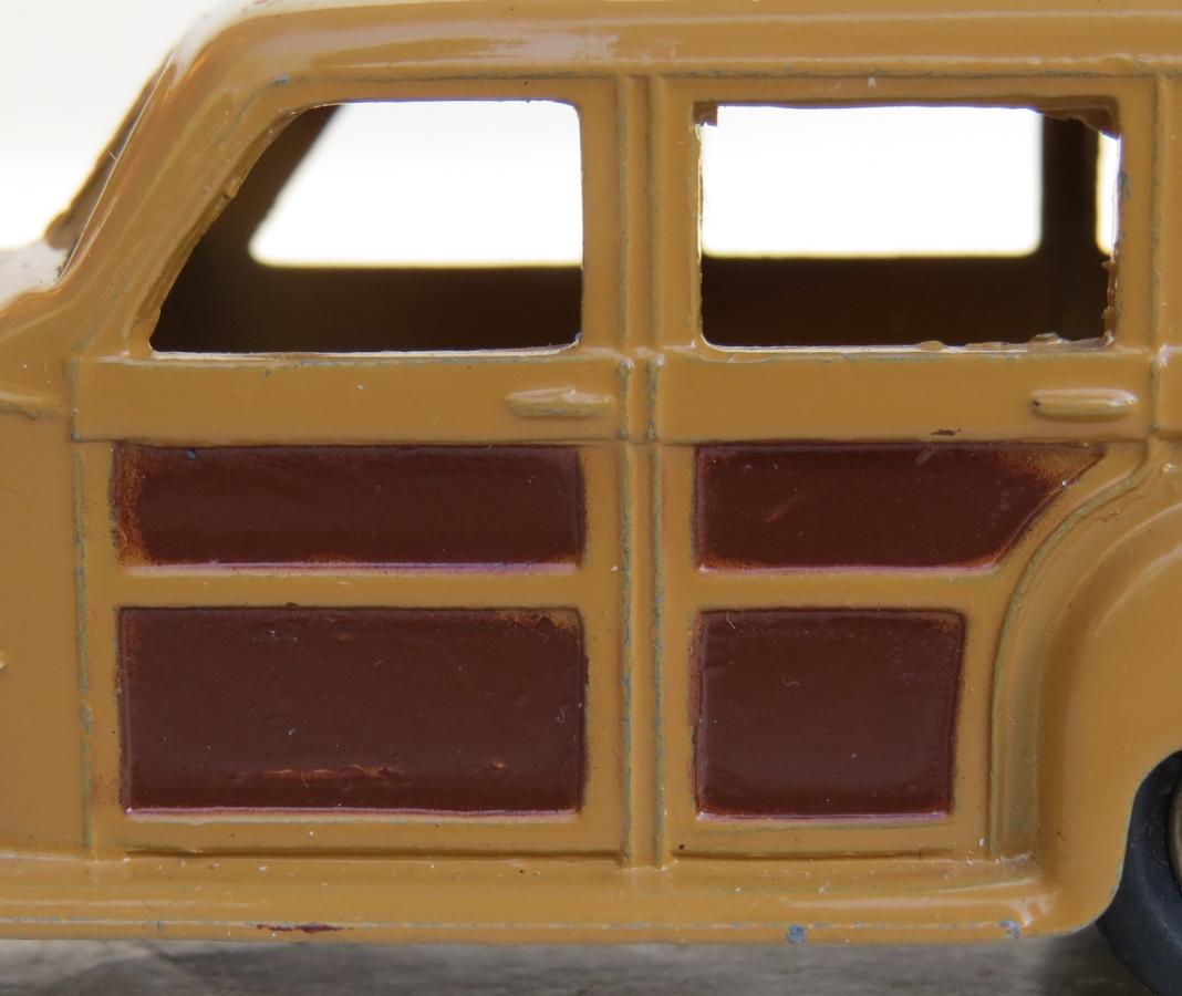 This certainly is a very nice model, and very popular over the years, but, like many models that Meccano made, it did stray some from the real car. In looking at real images of a 1948 Plymouth Station Wagon, it is clear that the whole roof area is somewhat more squared off on the Dinky model. The rear of the roof is actually curved down somewhat, and the sides also are slightly curved down. The roof area was also not steel, but appears to be some type of Naugahyde or other material, giving a more “flat” look, and definitely not glossy paint. Another collector I know has taken a badly scratched model and restored it, while also “super detailing” all the silver or chrome trim, plus he made the roof look like that synthetic material. The end result was quite attractive. I would never advocate adding detail painting on a nice Dinky, but on obvious reprints, it can look very nice if carefully done.