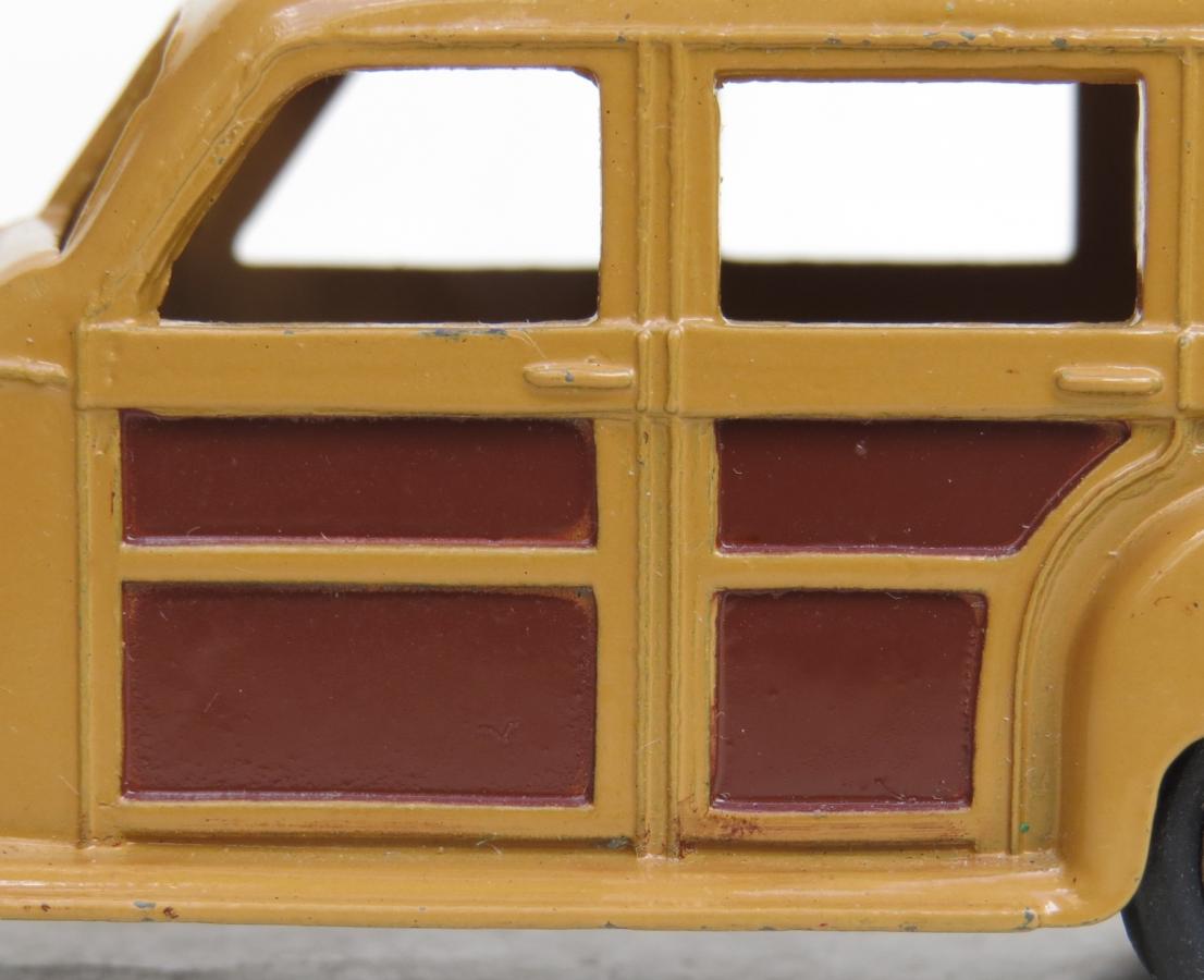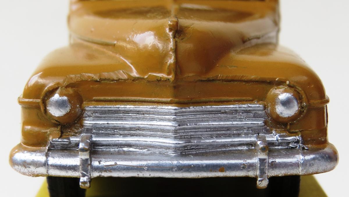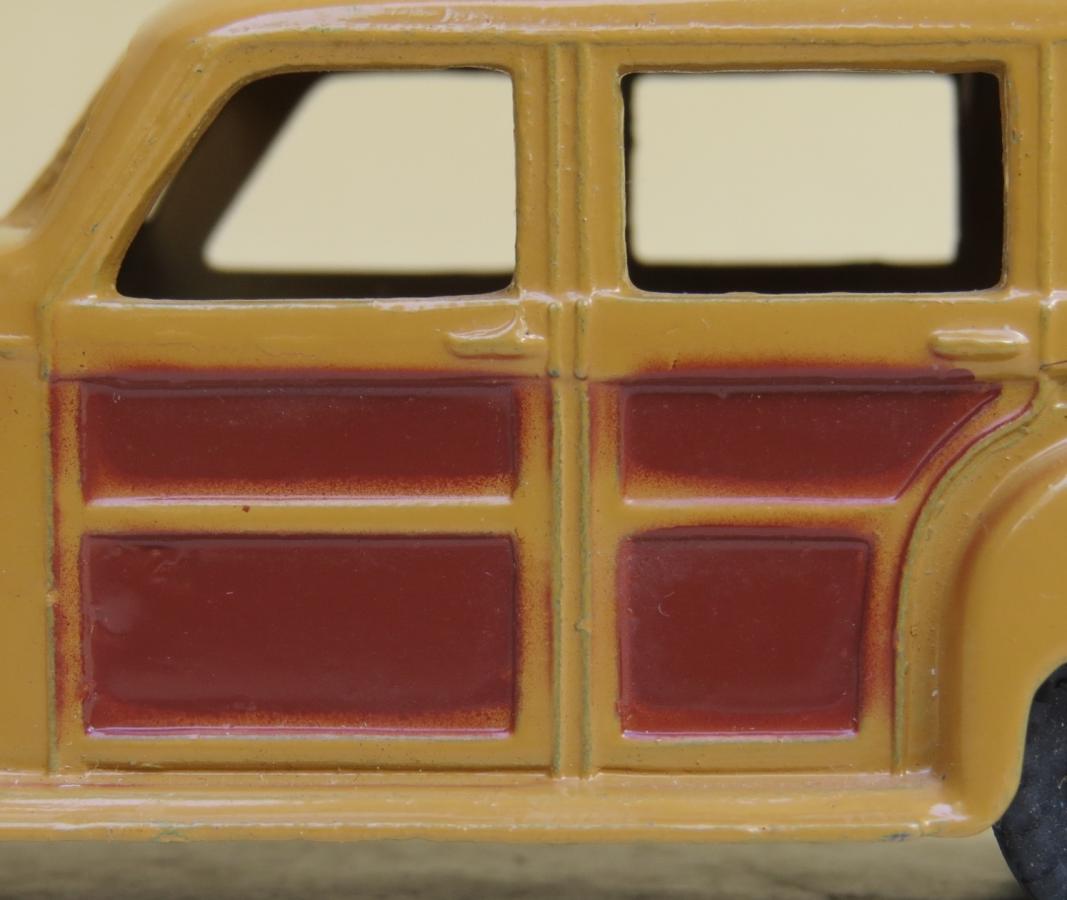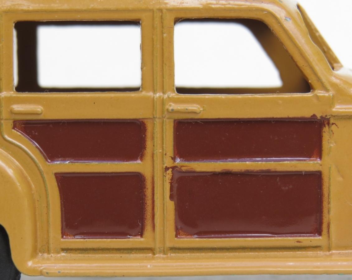 This certainly is a very nice model, and very popular over the years, but, like many models that Meccano made, it did stray some from the real car. In looking at real images of a 1948 Plymouth Station Wagon, it is clear that the whole roof area is somewhat more squared off on the Dinky model. The rear of the roof is actually curved down somewhat, and the sides also are slightly curved down. The roof area was also not steel, but appears to be some type of Naugahyde or other material, giving a more “flat” look, and definitely not glossy paint. Another collector I know has taken a badly scratched model and restored it, while also “super detailing” all the silver or chrome trim, plus he made the roof look like that synthetic material. The end result was quite attractive. I would never advocate adding detail painting on a nice Dinky, but on obvious reprints, it can look very nice if carefully done.