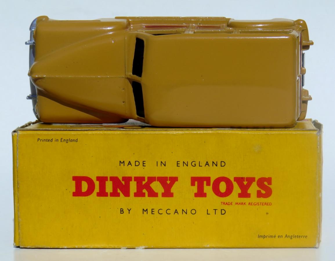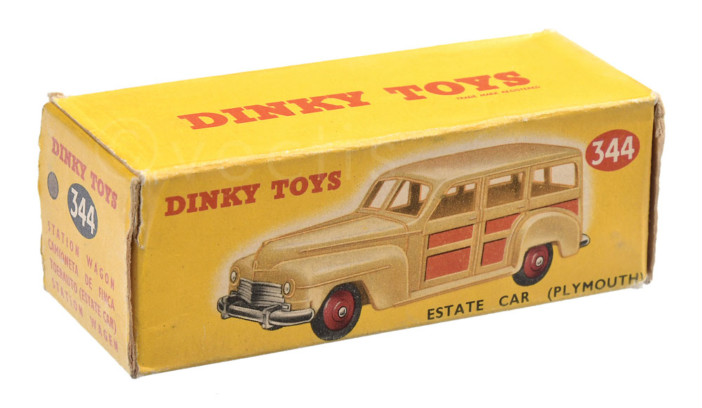 Recently I received this box that is hard to find. I found it on Ebay with a mint 344 model I already had, but the price was reasonable and another offer with this box was almost 3 times as expensive. The box is very special because it is the only box with the mention of the Plymouth brand name on it and an image on one side of the box with an Estate Car with red panels and red hubs, with which the model was never issued. The box also has a brown colour spot that is superfluous, because the model was always issued in a tan colour with brown panels. I have never seen another colour.