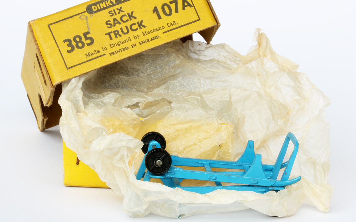 An almost full box of sack trucks without the dividers. Box dated January 1949, priced at 9d (nine pence) each. The box only came with a single Sack Truck, so were there any casting differences?