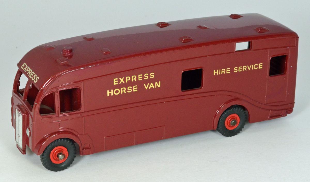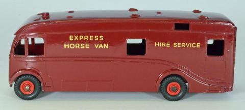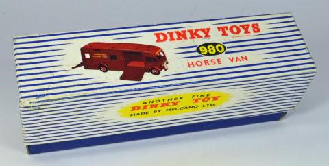 It is interesting to look at the U.S. catalogs, which H.Hudson Dobson distributed, as they never show the U.S. version, with its different lettering, but they do refer to it as #980 Horse Van. This ended with the 1959 catalog only showing #981 labeled as a Horse Box, so it appears that the U.S. version was discontinued by then, and the English version soldiered on until 1961.