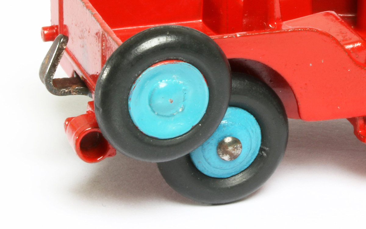 The Universal Jeep was basically sprayed red or green, and the army green, but many variants occur as the finish of the wheels is concerned. The initial red version had red or blue wheel hubs etc. and the early ones had smooth medium size tyres. Later on, starting ca. 1958, the treaded tyres were introduced. This is one of the few larger scale Dinkies which suited them perfectly. Other Dinky Toys tended to get a kind of unfair terrain vehicle looks, which this one happens to rightfully deserve in my opnion.