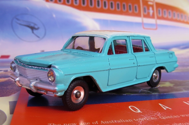 Here is the actual car in Tamar Turquoise and Atherton Ivory roof and next to it, the Dinky Toys 196 Holden Special Sedan, now in the true colours of a Special Sedan with a true blue Australian icon in the background, a period advertisement for QANTAS! To end this treatise on the 1962 Holden Special Sedan, here is the latest and unfortunately, last Holden to be built in Australia, the Holden SS-V Commodore. (Yes, for those from Europe, Holden \"borrowed\" the name Commodore from another General Motors product, the Opel Commodore.) Of course we still have another two years of manufacturing, so no doubt GM-H will undertake some minor tweaking to keep the model current and a little \"new\", but come 2017, that will be it. Farewell Holden! Welcome re-badging which Holden have already been doing for years such as the Astra and the current Cruze and Colorado. :(