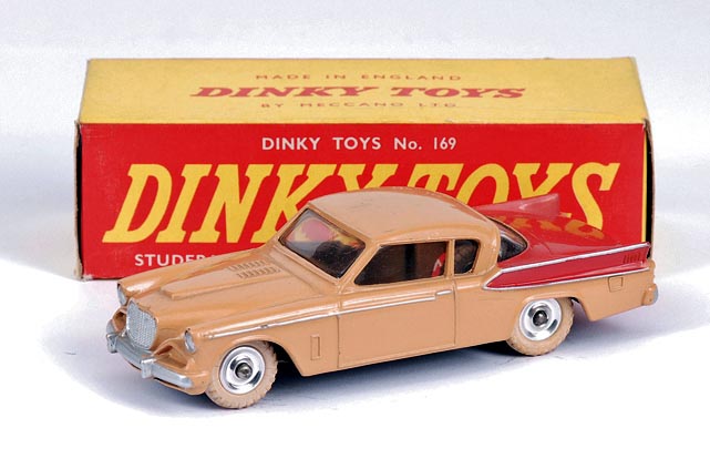 However, the catalogue showing the 169 Studebaker Golden Hawk is correct. The model was released with red ridged wheels.
