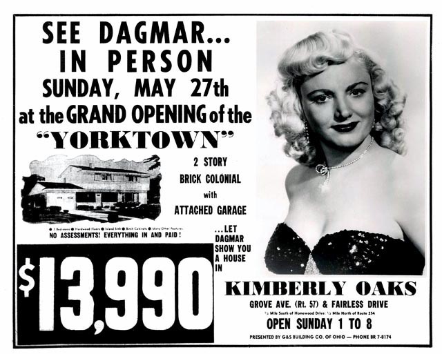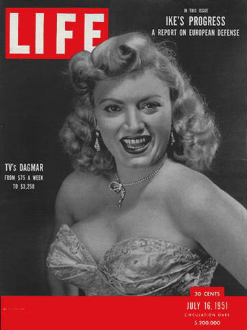 (Dagmar bumpers, (dag- mar), is a slang term for the artillery shell shaped styling elements found on the front bumper/grille assemblies on several makes of cars produced in the 1950s, in particular the Cadillacs, an era recognized for its flamboyant designs and prominent use of chrome details. The term was coined by customers in direct reference to Dagmar, an early 1950s television personality well known for her pronounced cleavage. Dagmar's physical attributes were further enhanced by low-cut gowns and the shape of her bra cups, which were somewhat conical. She was amused by the tribute.