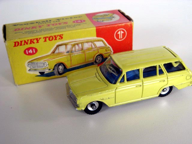 The Dinky Toys model of the FB Victor was announced to the world in the April 1963 issue of the MM, with glowing descriptions of both the real car and the Dinky model: "A Victor for Vauxhall - a Winner for Dinky Toys" - but unusually Dinky had chosen to model the estate car version, which they described as having "The clean line of good design - perhaps the most beautiful ever built!" (in those days in advertising, you could get away with outlandish claims by adding the words 'possibly, perhaps, etc. - i.e. anything unspecific which implied even the remotest chance of truth) and it went on to say that the model was "fully equipped with Dinky Toys special features and it has an opening tailgate, too". The model was priced at 4/11d and seems to have been available until sometime in 1967 - the last reference I have found is on a leaflet printed for the U.S. (reference 72577/3, 1967, but actual date unknown) which introduces the new 'Thunderbirds' models 100 and 101 - the yellow border has outline drawings of many models, including the back half of the Vauxhall with it's tailgate open.