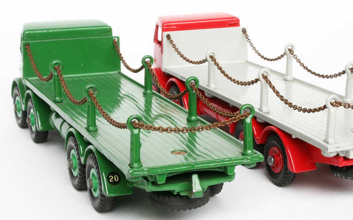 Jan----Another most wonderful article on a very popular Dinky Supertoys.  I remember being a youngster and having never seen a "chain lorry" here in the US, was somewhat in wonder with it.  Years later I finally got my own copy, and it has been a Foden favorite even since.  Since you provided so much history, along with very nice photography, I will only add some more details on the first model.  As you mentioned, this was only made for a short period, starting in early 1952 and was superceded by the newer model in September of that year.  Some time ago, I was able to acquire an example of this early model, and it also happens to be in green, the same color of my later example, so the two make an interesting comparison.  You will notice that my example has been dropped at some point in time, resulting in the posts on the right side being bent....and I have heard from several experts not to try and straighten them...they will break!  I have included some photos below, showing the two of them together.  There is also a photo of the underside of both of them, to show just how very different the chassis was.  The early version has the thinner axles, all of which are mounted via sheet metal clips to the chassis.  And notice that there is a raised area, where the rear wheels are located, to get the axles to the proper height.  This raised area was not needed when the newer version used diecast lugs to retain the axles.  The underside also clearly shows that the bottoms of the chain posts are indeed dimpled, as was the case until later.  Moving to the exterior views, the early model came with the ridged wheels, and of course, the cab is completely different in design and also has the distinctive colored "flash" added.  All in all, a most interesting and attractive model!