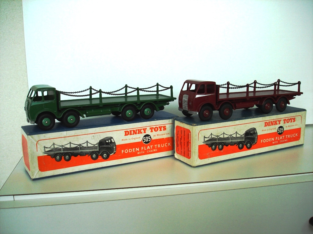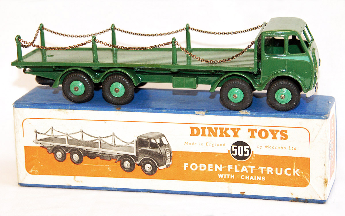 On 6 September 1997, Vectis Auctions at the Civic Hall, London Road, Guildford, Surrey, auctioned two 505 Foden Flat Truck with Chains, one in green and the other maroon. The maroon example, Lot 901 sold for ₤470 and the green example in superb A to A+ condition Lot 900 fetched ₤1600.  This lot had the original date of purchase of November 1951 added in ink to the base of the box.