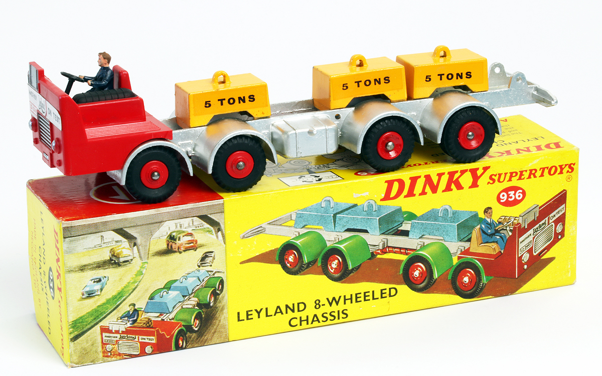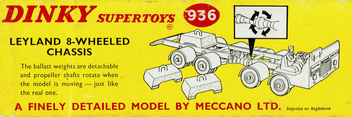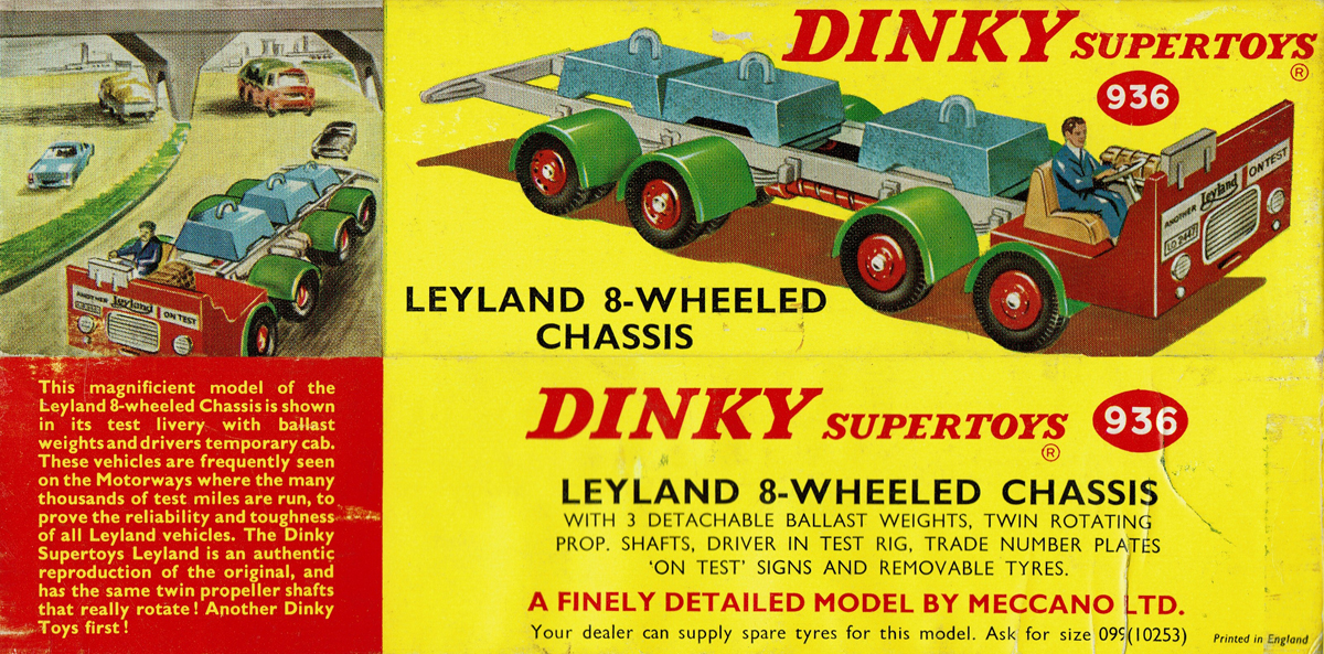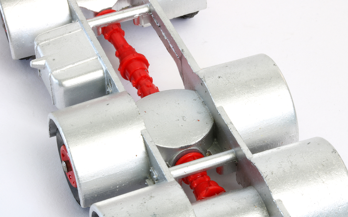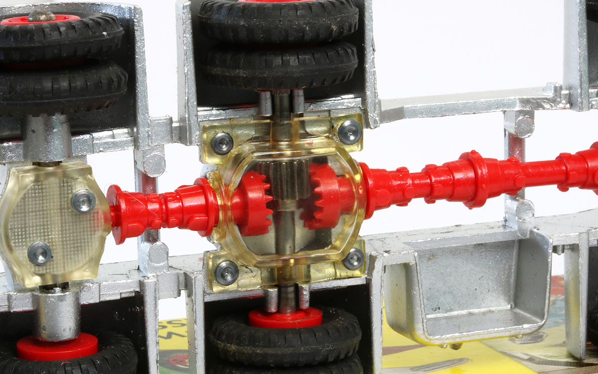 A fascinating model this is. Cecil Gibson said: ‘… A much more courageous issue in September [1964] was a Leyland 8-wheel chassis, representing something seen on the road but never modelled. The bare chassis carried a half cab and driver, and three ballast weights. The prop-shaft rotated when the vehicle moved …’. Like so many models of this era it contains a lot of plastic, which was slowly replacing many former diecast parts.