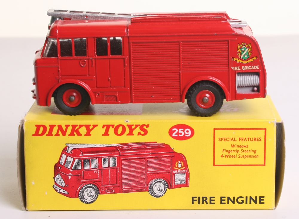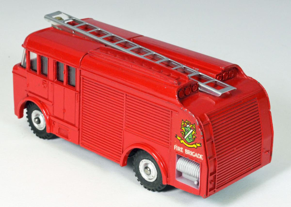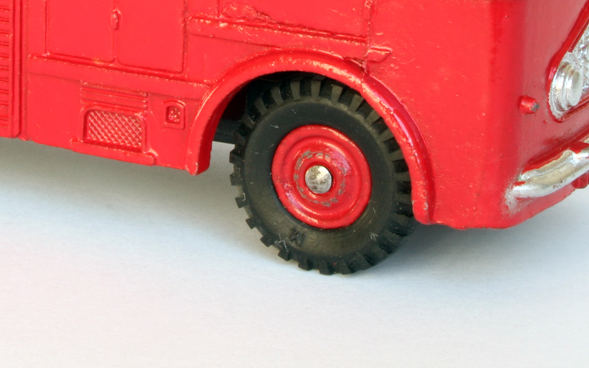 As you are probably aware, the 259 Miles Fire Engine model, being introduced in 1961, was towards the end of the 'Spun Hub' phase of Dinky production when many of the then current car models were fitted with the standard Spun Hubs - but very few non-car models were fitted with them. This model is one of the few exceptions, in fact, the picture of the model on the fragile flap-ended boxes shows the model with Spun hubs - around 1963, they were replaced with Plastic hubs which were used until the model was discontinued.