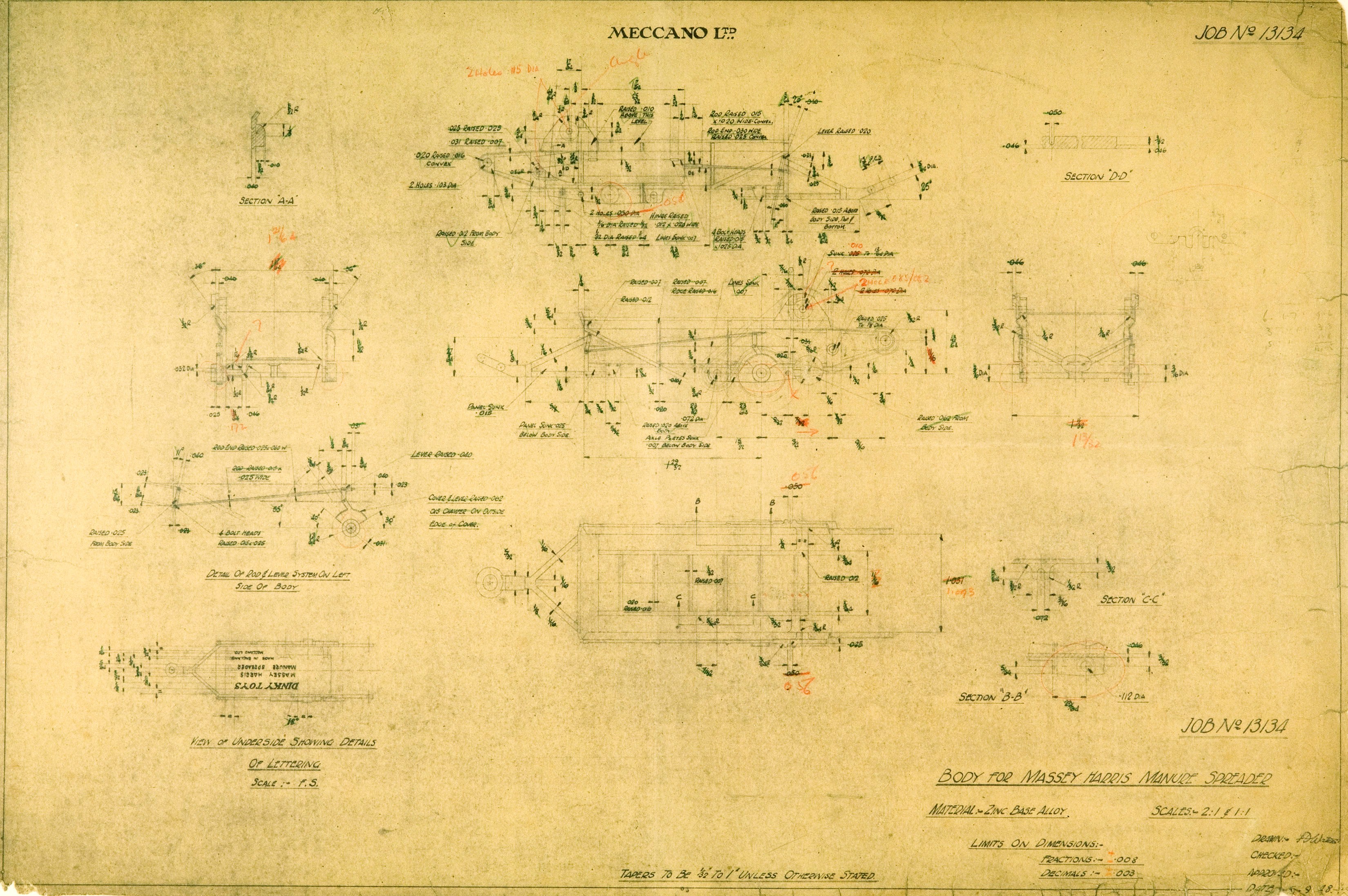 Note this is a photograph of the full image. It appears this print was made from the factory photostat of the original technical drawing and the red notation indicates the rough changes to be made to the original drawing.