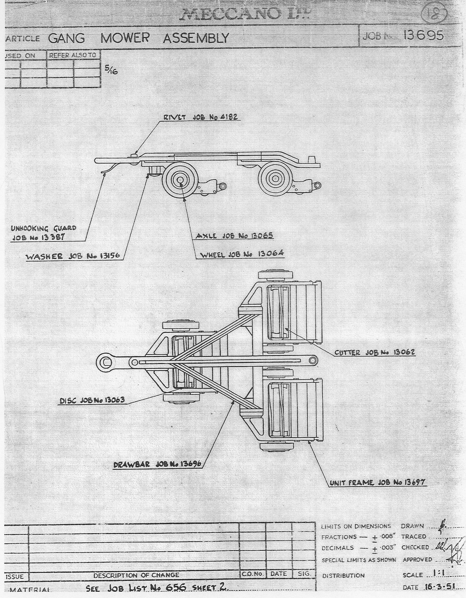 Publication Year: 1952Publication Type: Factory DrawingsCountry: EnglandThis is the factory drawing for the 27j/323 triple Gang Mower (Assembly), produced from 1952 to 1958. This image has been donated to the DTCA by Mike Richardson.