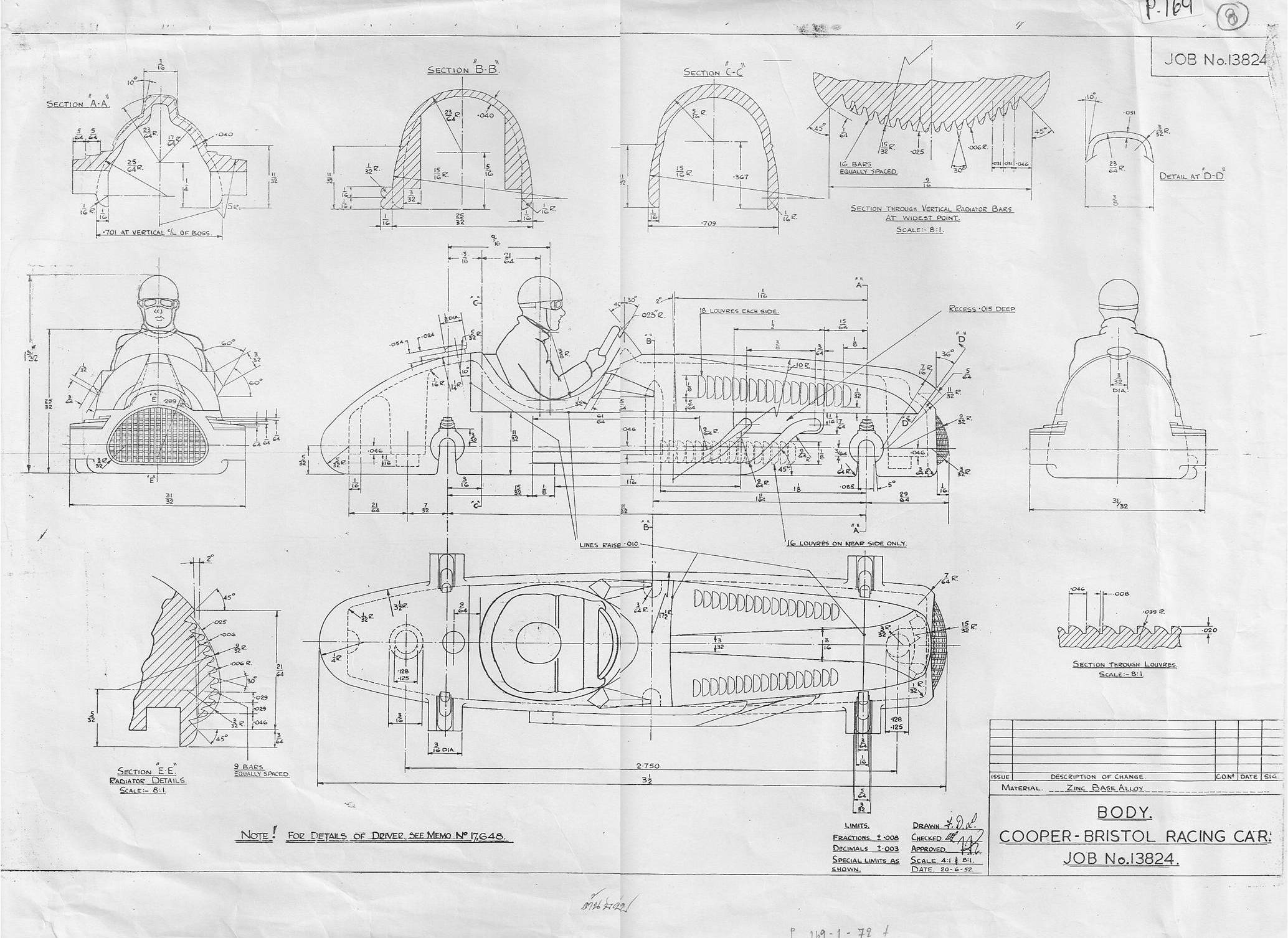 Publication Year: 1953Publication Type: Factory DrawingsCountry: EnglandThis is the factory drawing for the 23g/233/208 Cooper Bristol Racing Car Body, produced from 1953 to 1964. This image has been donated to the DTCA by Mike Richardson.