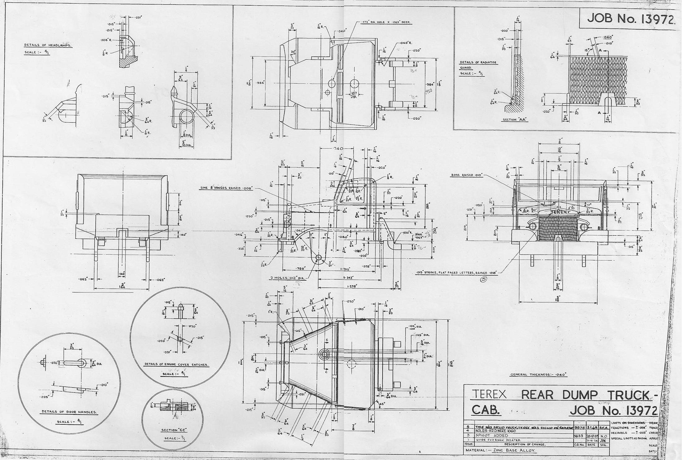 Publication Year: 1971Publication Type: Factory DrawingsCountry: EnglandThis is the factory drawing for the 965 Terex Rear Dump Truck (Formerly Euclid), produced from 1955 to 1969 as a Euclid and 1969 to 1970 as Terex. to 1971. This image has been donated to the DTCA by Mike Richardson. Cab: