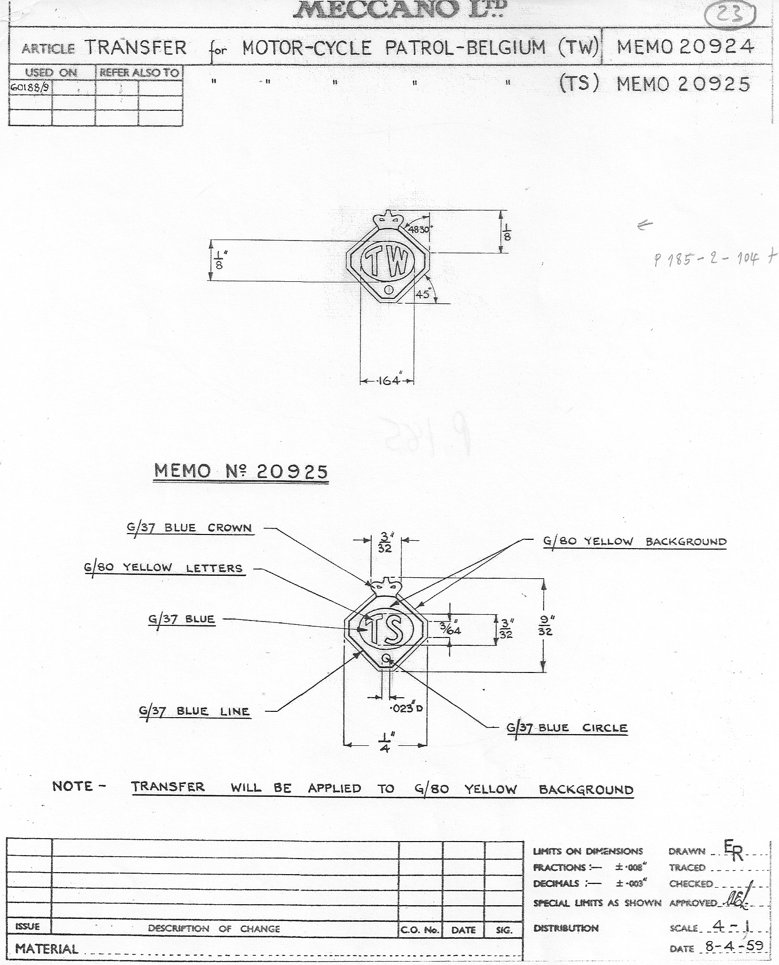 This are the factory memos for emblems for the post war 44b/045/270 AA Motorcycle Patrol and the 271 Belgian (TS/TW) and 272 Dutch (ANWB) versions. AA version, produced from 1948 to 1963. TS verson in 1960(?) and the ANWB version in 1960(?). the Great Book of Dinky Toys states these were available in 1955? but the drawings are dated 1959 which indicates they were sold around 1960.The TW variation is not listed by Richardson or Ramsay, presumably not issued.
